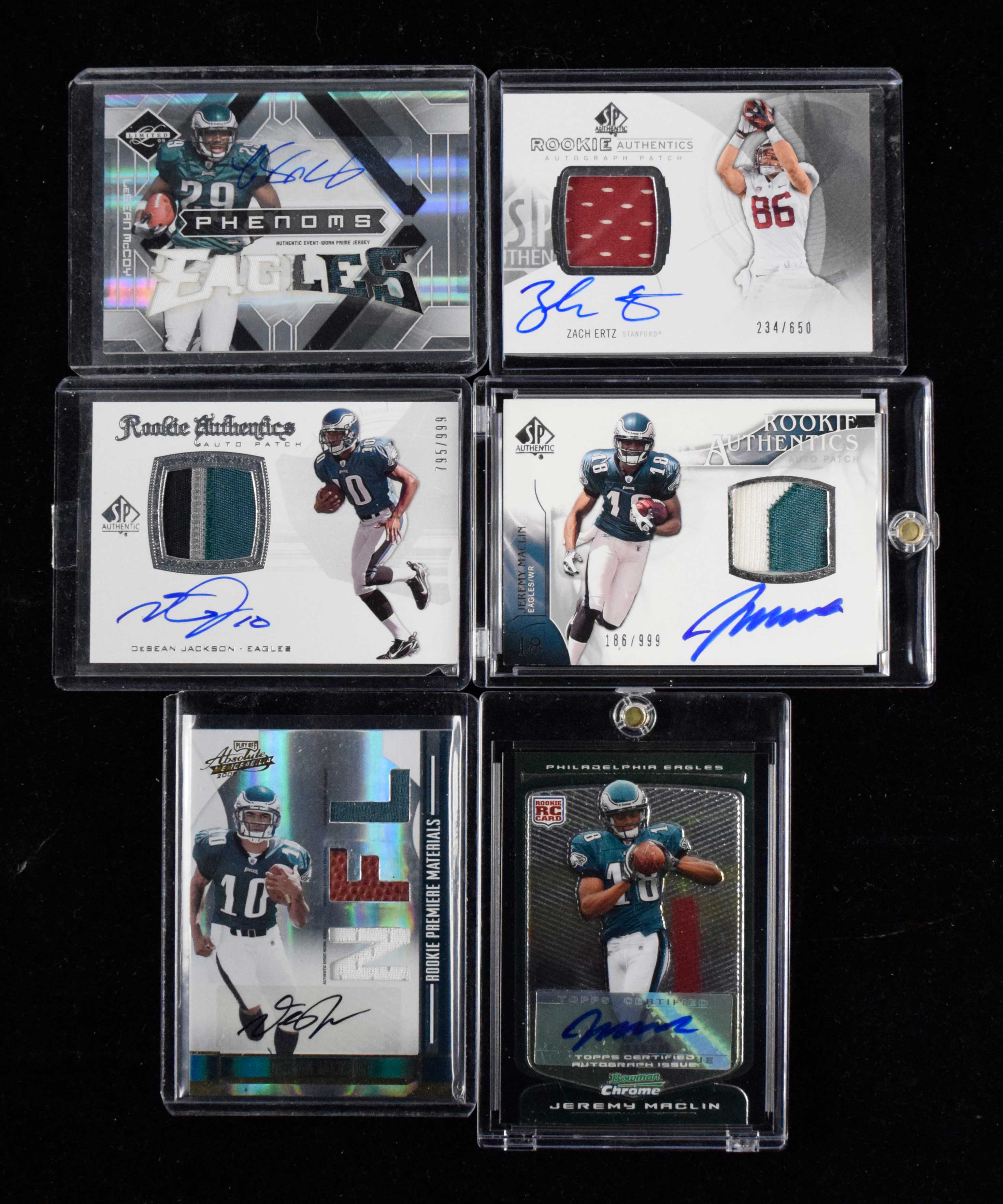 Description:Lot of (7) signed football rookie cards including serial #ed and relics (NM-NM/MT). Includes 2008 Playoff Absolute Memorabilia #260 triple relic card signed by DeSean Jackson (#ed 41/299), 2008 SP Authentic #290 patch card signed by DeSean Jackson (#ed 795/999), 2009 Bowman Chrome "Rookie Autographs" #140 signed by Jeremy Maclin, 2009 Donruss Limited #208 jersey card signed by LeSean McCoy (#ed 118/149), 2009 SP Authentic #385 patch card signed by Jeremy Maclin (#ed 186/999), 2009 Upper Deck Black #120 signed by LeSean McCoy (#ed 112/199), and 2013 SP Authentic #166 patch card signed by Zach Ertz (#ed 234/650). Signatures rate 8/9 to 10 out of 10: NM-NM/MT