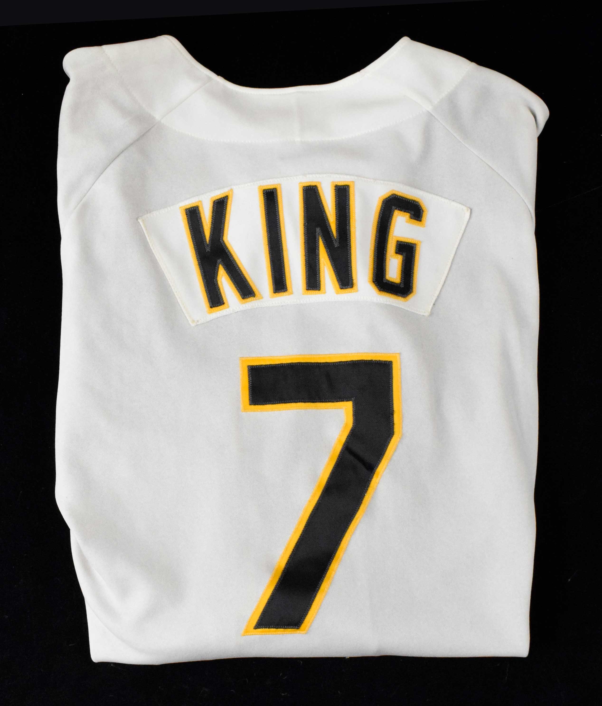 Description:1992 Jeff King professional model Pittsburgh Pirates jersey (EX). Rawlings size 42 jersey with "PIRATES" and #7 sewn on the front, along with "KING" nameplate and #7 sewn on the back. Team logo patch is sewn on the left sleeve, and Rawlings tagging is sewn inside the front tail with "SET 2 1992" flag tag attached. Phenomenal use with multiple stains: EX