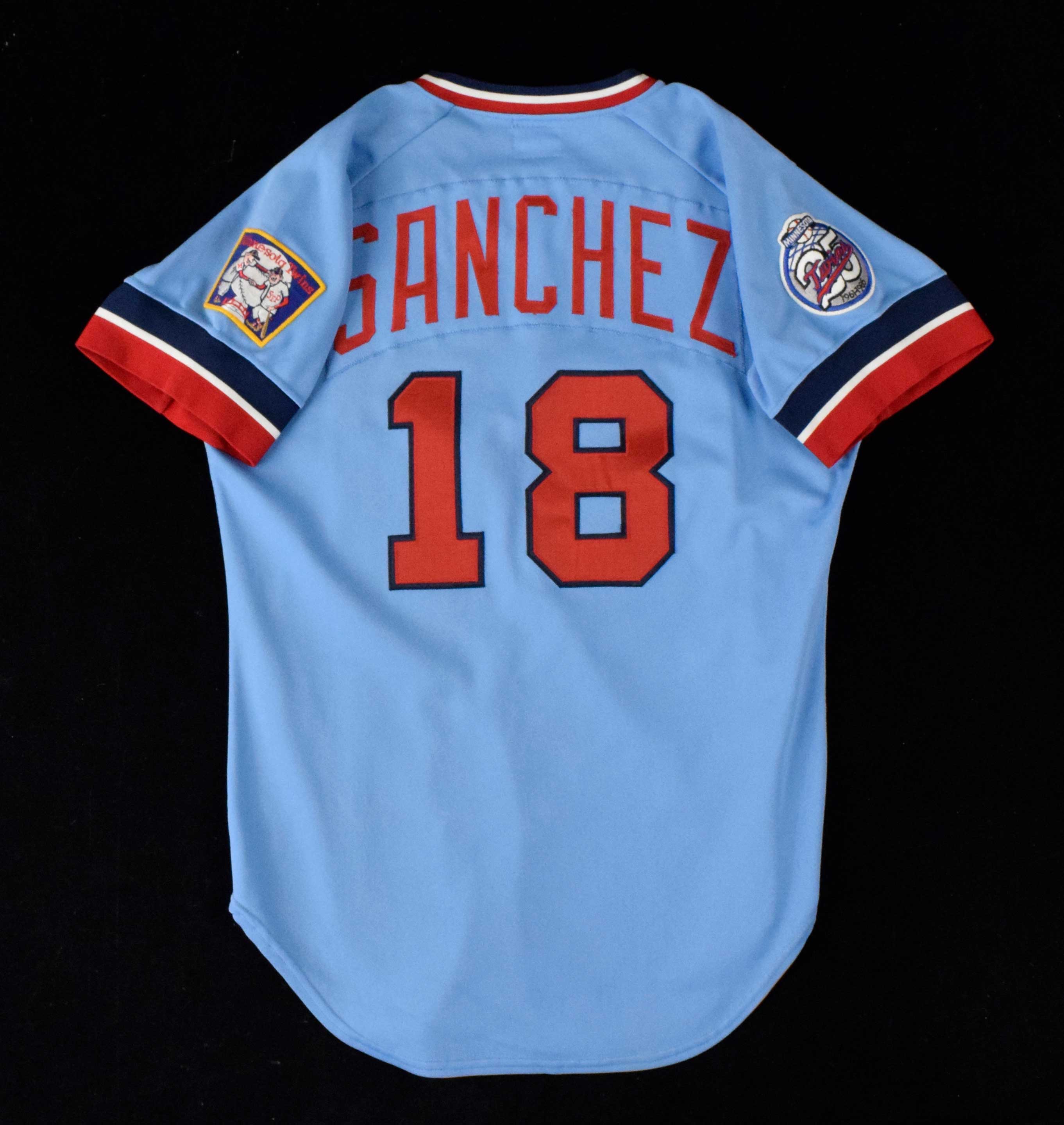 Description:1986 Alejandro Sanchez professional model Minnesota Twins jersey (EX/MT). Wilson size 42 jersey with "Twins" and #18 sewn on the front, along with "SANCHEZ" nameplate and #18" sewn on the back. Team logo patch is sewn on the left sleeve, and 25th Anniversary patch is sewn on the right sleeve. "86 1" year/set tag is sewn on the front tail, and Wilson tag is sewn inside the collar. Light overall use/wash wear: EX/MT