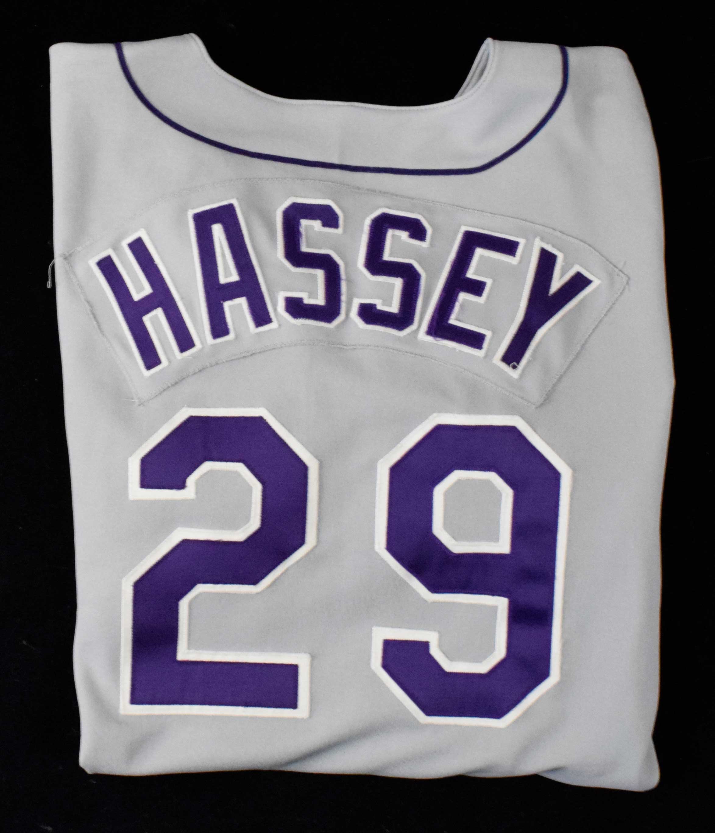 Description:1994 Ron Hassey professional model Colorado Rockies jersey (EX/MT). Russell Athletic size 50 jersey with "ROCKIES" sewn across the front, along with "HASSEY" nameplate and #29 sewn on the back. MLB 125th Anniversary patch is sewn on the right sleeve, and team logo patch is sewn on the left sleeve. Russell Athletic tagging is on the front tail with "1994-2" and "100% Polyester" tags below. Light overall use/wash wear: EX/MT