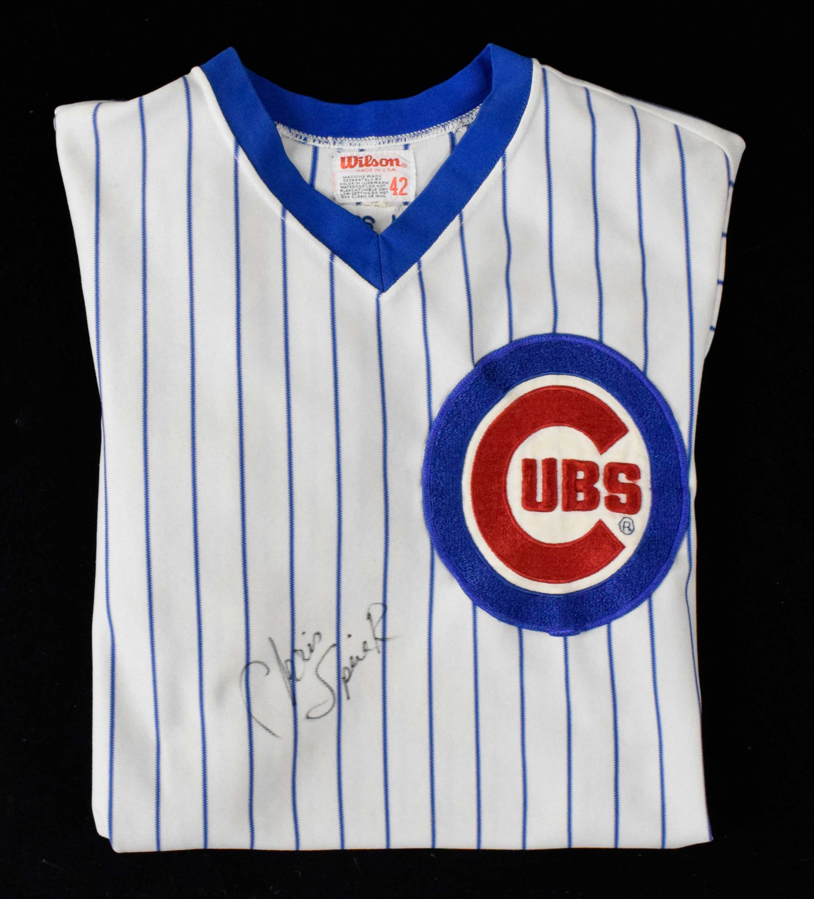Description:Chris Speier signed 1986 Chicago Cubs professional model jersey (EX). Wilson size 42 jersey with large Cubs logo sewn on the front and #28 sewn on the back. "86" year tag is sewn on the front tail, and team logo patch is sewn on the left sleeve. Wilson tag is sewn inside the collar, with "28 86 1 42" strip tag below. Speier signed the jersey in black marker. Signature rates 8 out of 10: EX