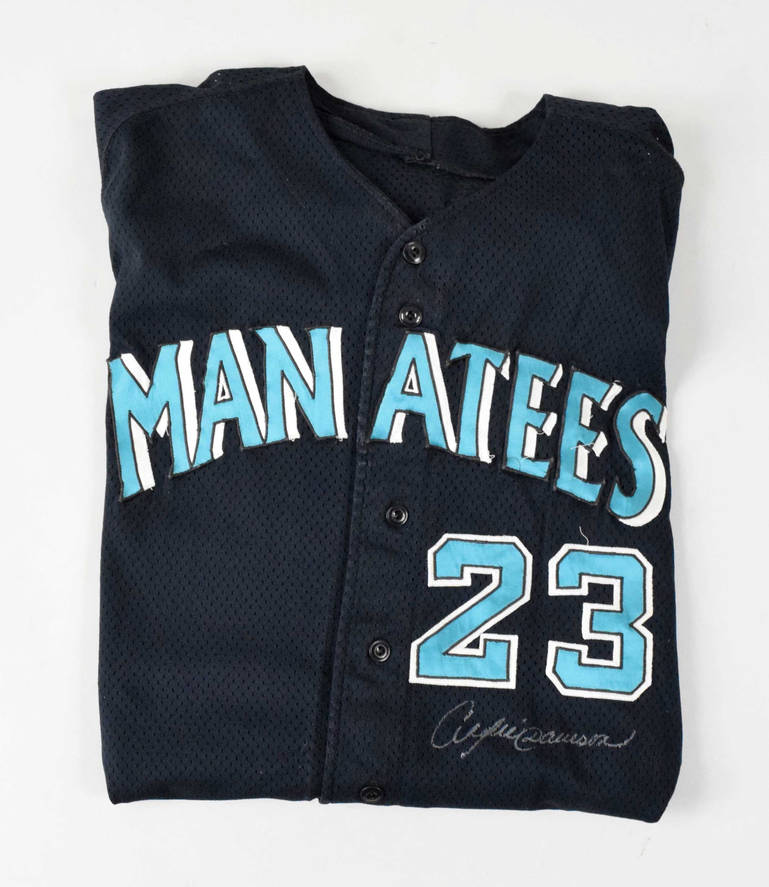 Description:Andre Dawson signed 1995 Brevard County Manatees professional model jersey (EX/MT). Pro Pak Speedline size 44 Manatees #23 jersey signed by Dawson in silver marker. Signature rates 8 out of 10. Rare jersey as Dawson played only a 3-game rehab stint in 1995 with the Manatees, wearing #23. Light overall use/wash wear: EX/MT
