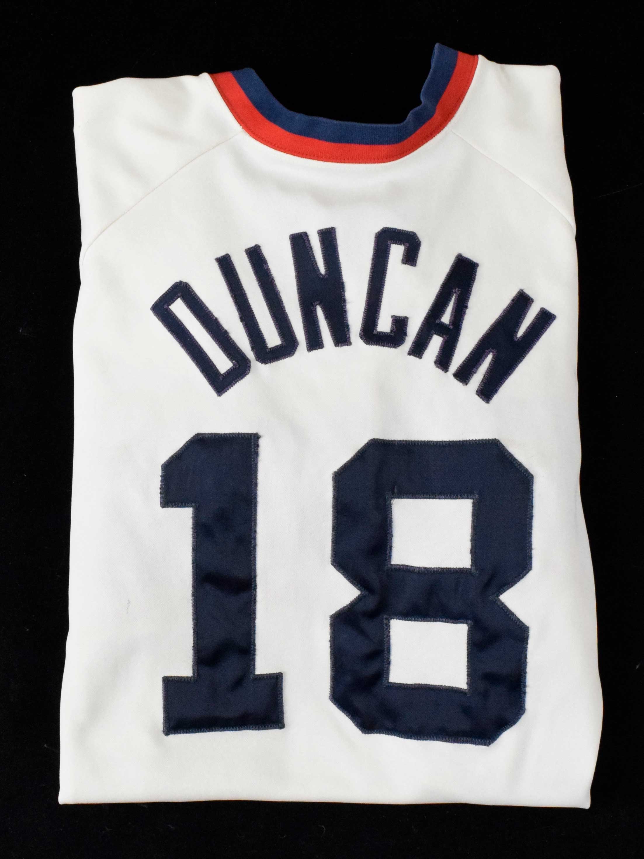 Description:1985 Dave Duncan professional model Chicago White Sox jersey (EX). Sand-Knit size 44 jersey with "SOX" sewn across the front, along with "DUNCAN" and #18 sewn on the back. Comiskey Park 75th Anniversary patch is sewn on the left sleeve, and "85" "44" year/size tag is sewn inside the tail. The front tail has Medalist/Sand-Knit's "Designed & Tailored Exclusively for the Chicago White Sox" tag alongside the MacGregor/Sand-Knit size tag. Light stains visible: EX
