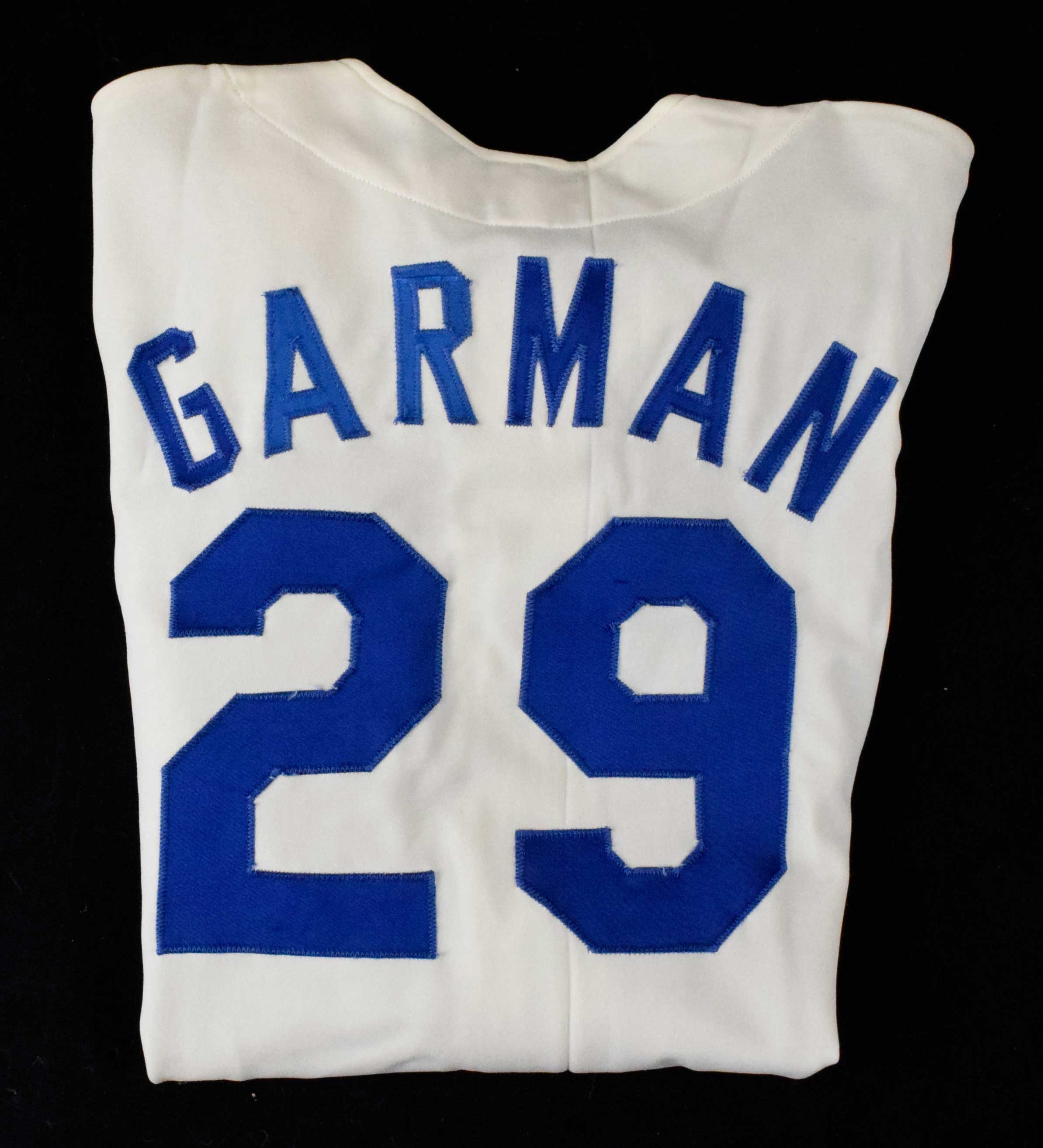 Description:Mike Garman professional model Los Angeles Dodgers jersey, c.1977-78 (EX). Goodman & Sons size 44 jersey with "Dodgers" and #29 sewn on the front, along with "GARMAN" and #29 sewn on the back. Goodman tag is sewn inside the collar. Light wear with very minor stains: EX