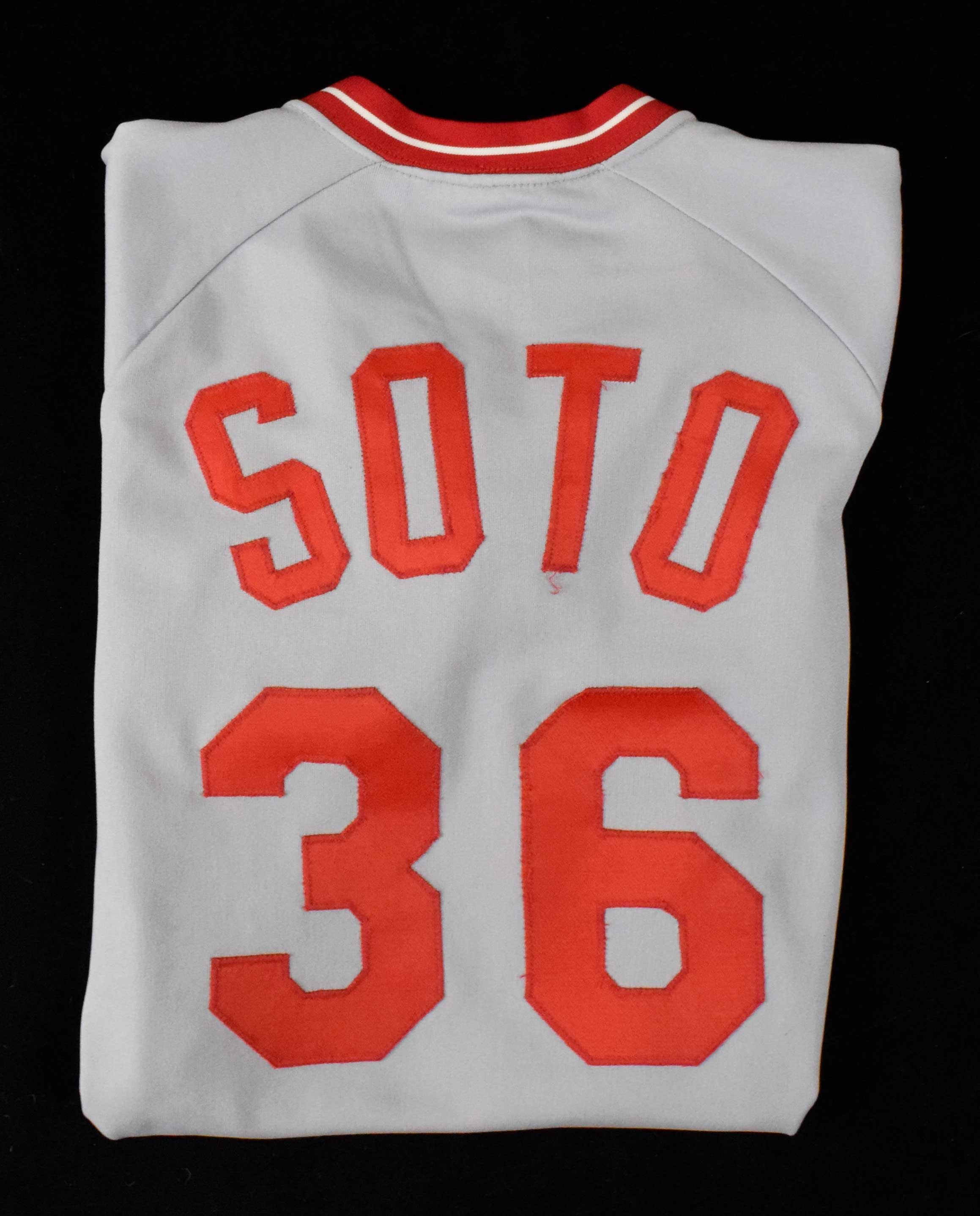 Description:1981 Mario Soto professional model Cincinnati Reds jersey (EX/MT). Wilson size 38 jersey with "CINCINNATI" and #36 sewn on the front, along with "SOTO" and #36 sewn on the back. "81 2" year/set tag is sewn below the Wilson tag on the front tail. Light overall use/wash wear: EX/MT