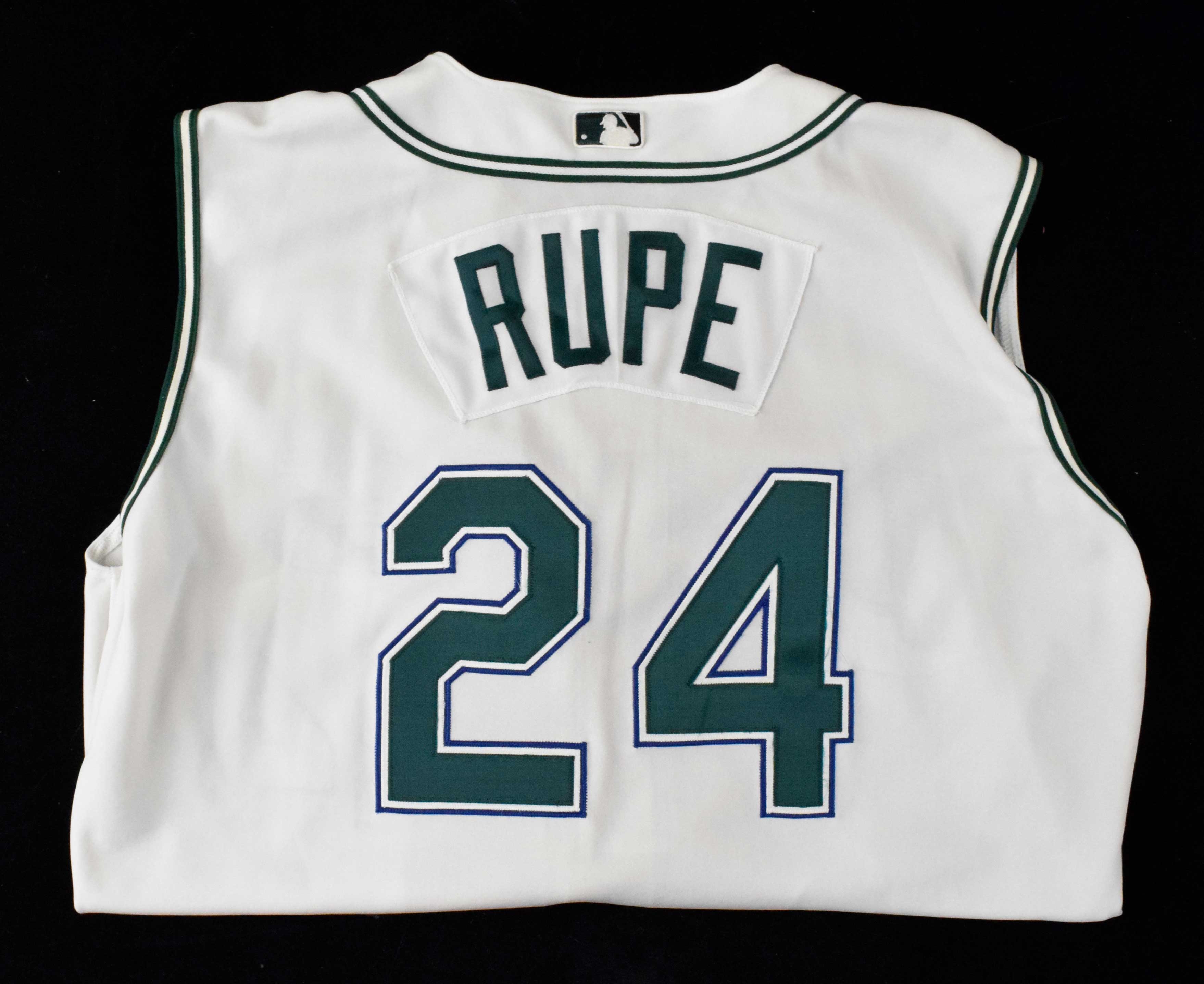 Description:Ryan Rupe professional model Tampa Bay Devil Rays jersey, c.2001-02 (EX). Russell Athletic MLB Authentic Collection vest style jersey with "RAYS" and #24 sewn on the front, along with "RUPE" nameplate and #24 sewn on the back. Flag tags are attached to the Russell Athletic tag on the front tail, but the text is faded away: EX