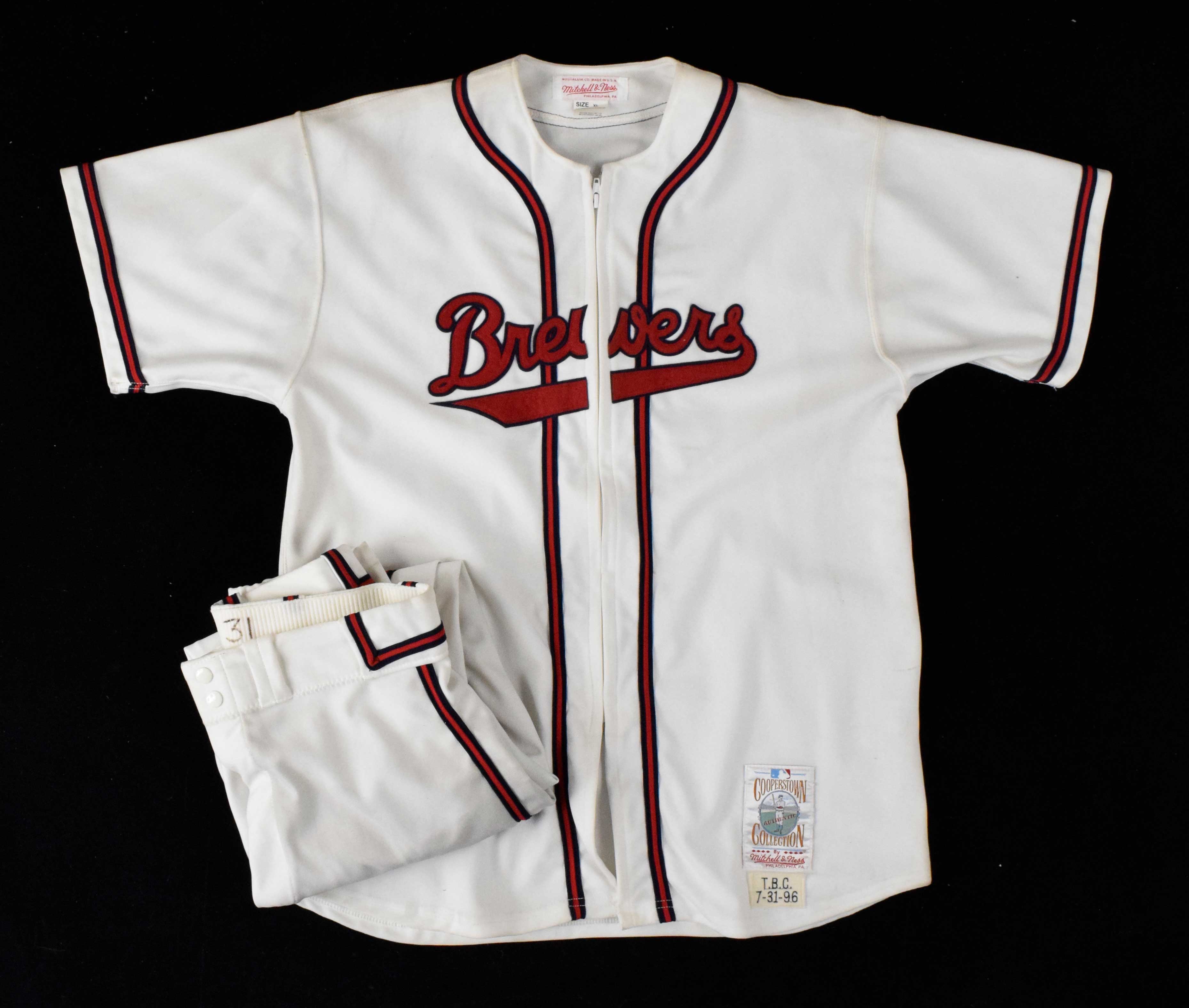 Description:Tim Van Egmond professional model Milwaukee Brewers 7/31/1996 Turn Back The Clock game jersey & pants (EX-EX/MT). Mitchell & Ness size XL 1946 style Brewers #31 Tim Van Egmond jersey with "T.B.C. 7-31-96" tag on the front tail which was worn during their Turn Back The Clock game against the Mariners. Includes matching Mitchell & Ness size 34 pants with #31 written inside the waist. Van Egmond did not pitch in the game, but the backside of the pants are stained: EX-EX/MT