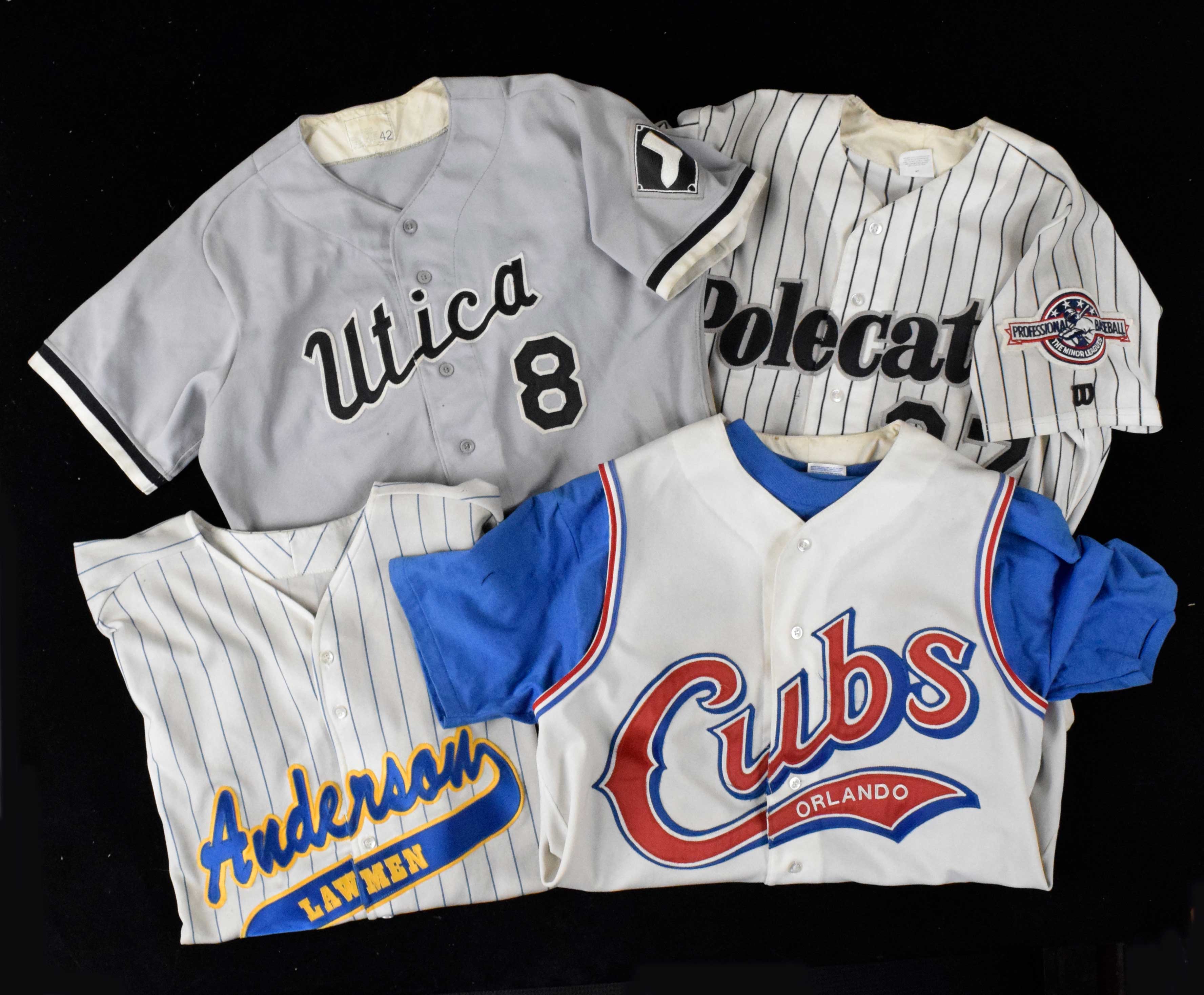 Description:Anderson Lawmen, Albany Polecats, Orlando Cubs, Utica Blue Sox professional model jerseys (EX-EX/MT). Includes c.1991-92 Wilson size 42 Utica Blue Sox #8 jersey, c.1993-96 Wilson size 44 Orlando Cubs #17 jersey with undershirt, c.1994-95 Wilson size 44 Albany Polecats #27 jersey, and 1995 DA Athletic size L Anderson Lawmen #32 jersey: EX-EX/MT