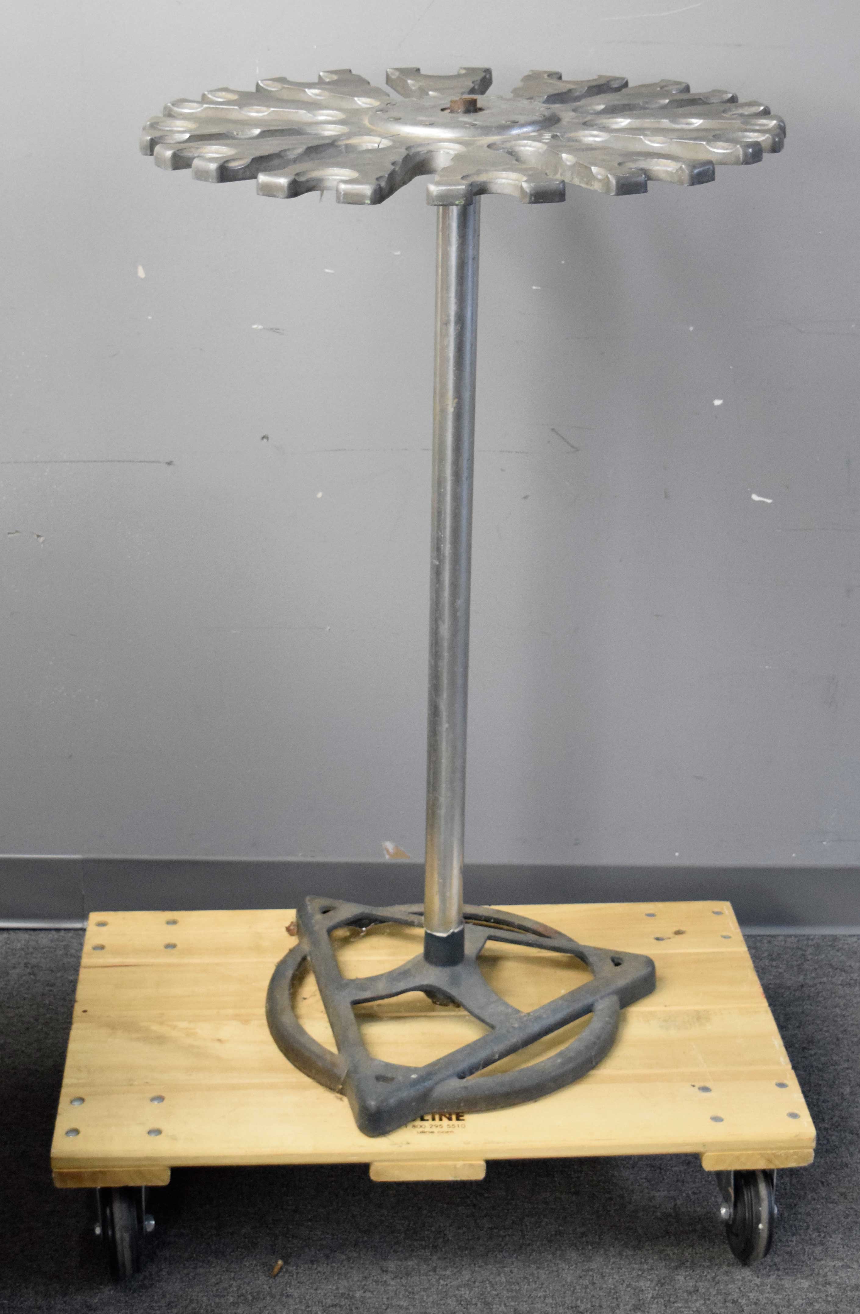 Description:Vintage metal baseball bat rack (EX). Measures approx. 38" tall, with spots for 48-bats (3 per space along with one at the end of each arm). Still spins as designed, but appears to be missing a piece at the very top: EX