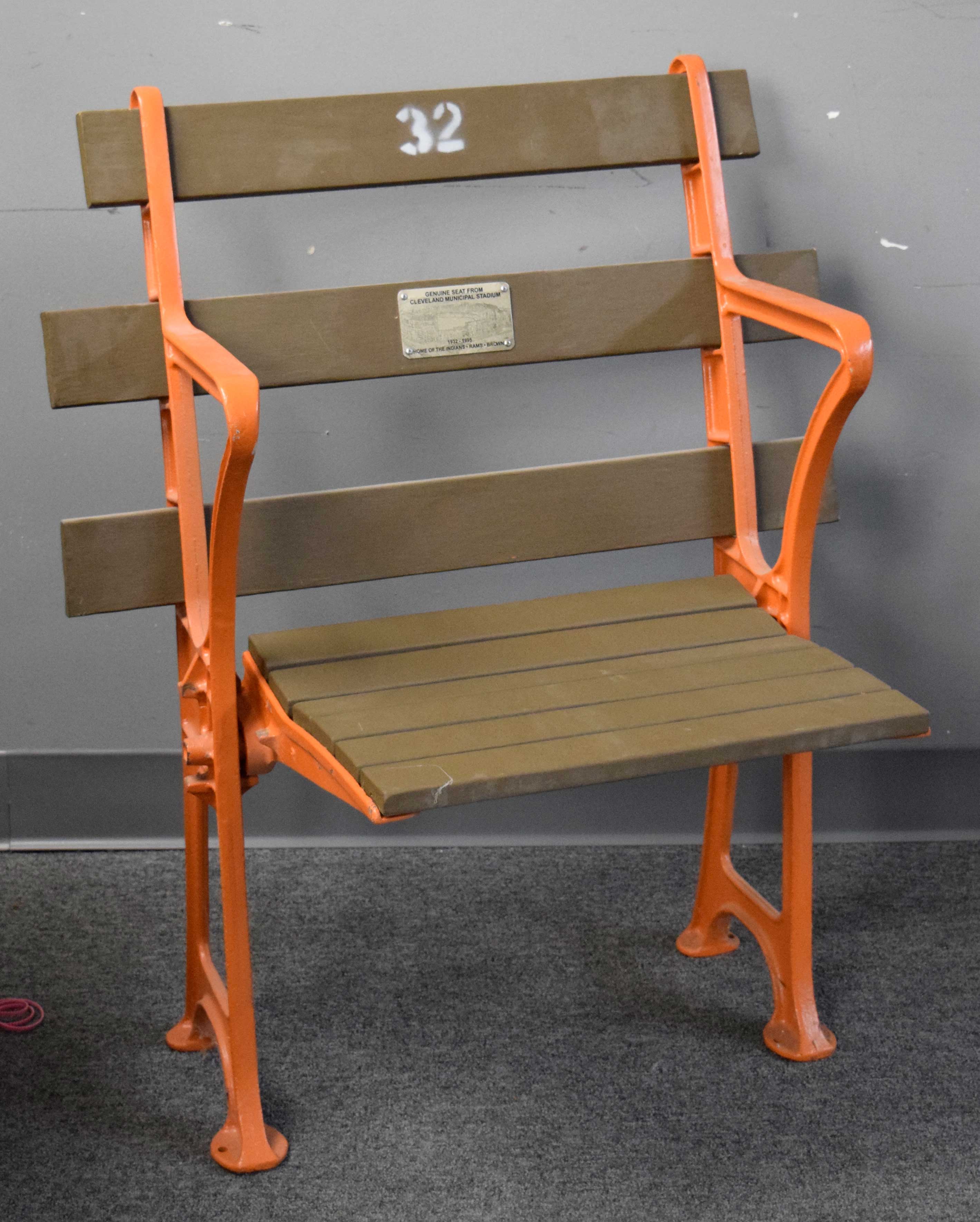 Description:Cleveland Municipal Stadium seat - repainted (EX/MT). Free standing seat with orange painted metal frame and brown painted backrest slats and seat. #32 is painted at the top of the backrest, and there is a descriptive placard at the middle of the backest: EX/MT