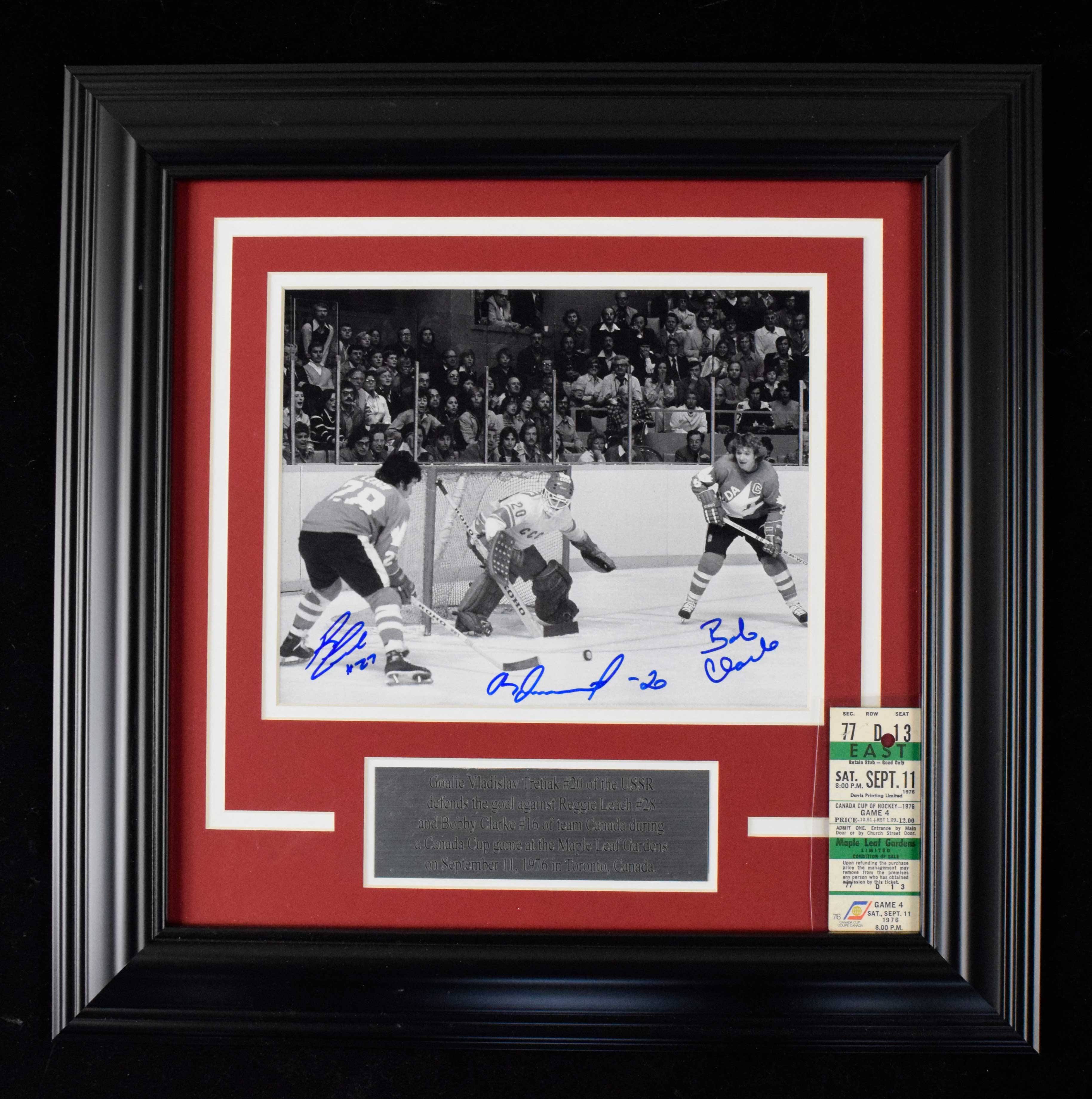 Description:Bob Clarke, Vladislav Tretiak, Reggie Leach multi-signed Canada Cup photo with 1976 ticket stub from game pictured (VG-NM/MT). Includes 9/11/1976 Maple Leaf Gardens ticket stub from Canada Cup game in which Canada defeated USSR by a score of 3-1 (VG); and 18"x18" framed photo multi-signed by Bobby Clarke, Vladislav Tretiak, and Reggie Leach in blue marker rating 9 to 10 out of 10 (NM-NM/MT).