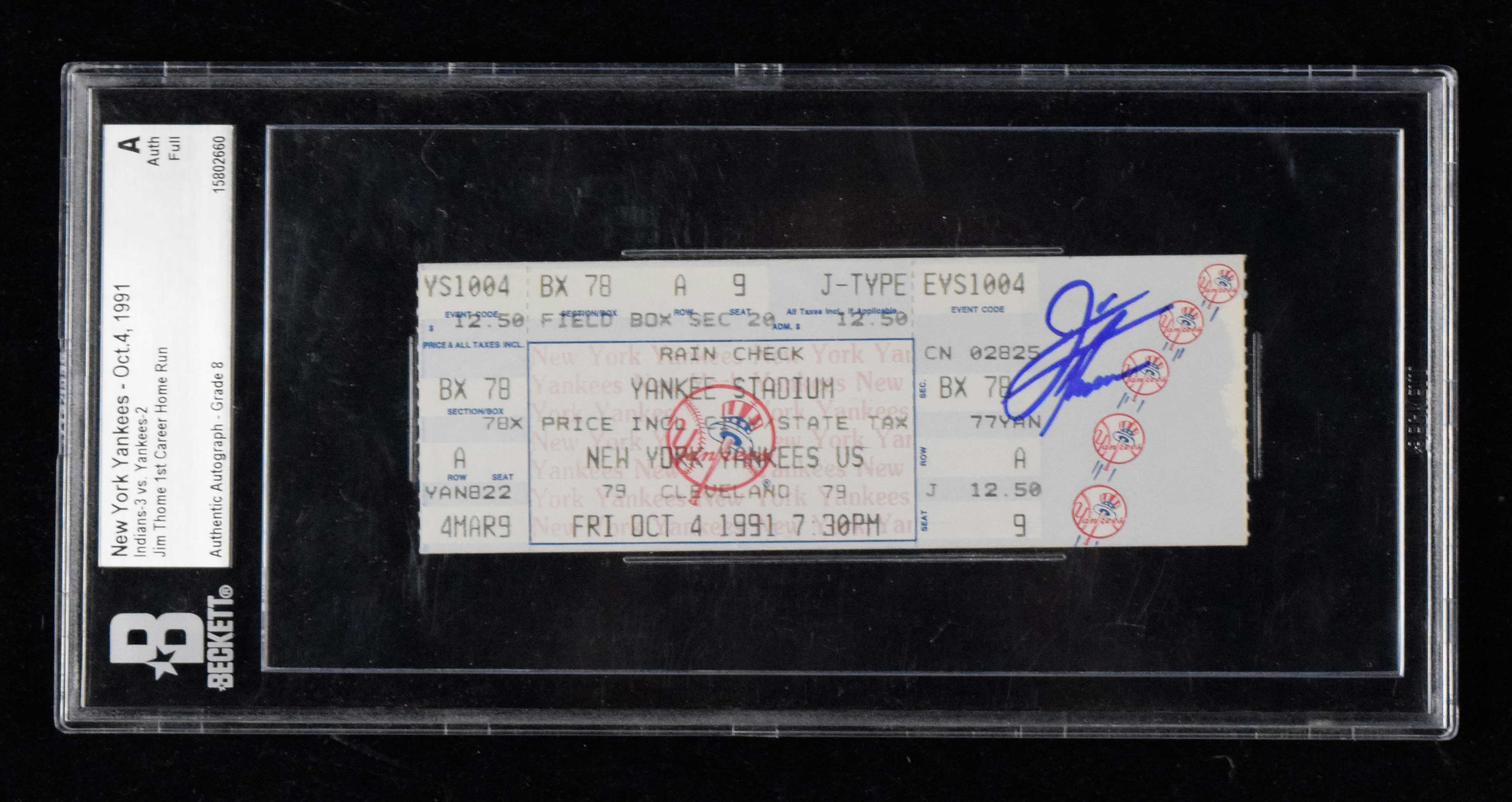 Description:Jim Thome signed 1st MLB home run full ticket - Beckett Authentic (EX). October 4th 1991 Cleveland Indians at New York Yankees full ticket for game in which Thome hit his 1st career HR. Thome signed the ticket in blue marker. Encased within Beckett Authentic holder with an autograph grade of 8. Minor paper loss at right edge: EX