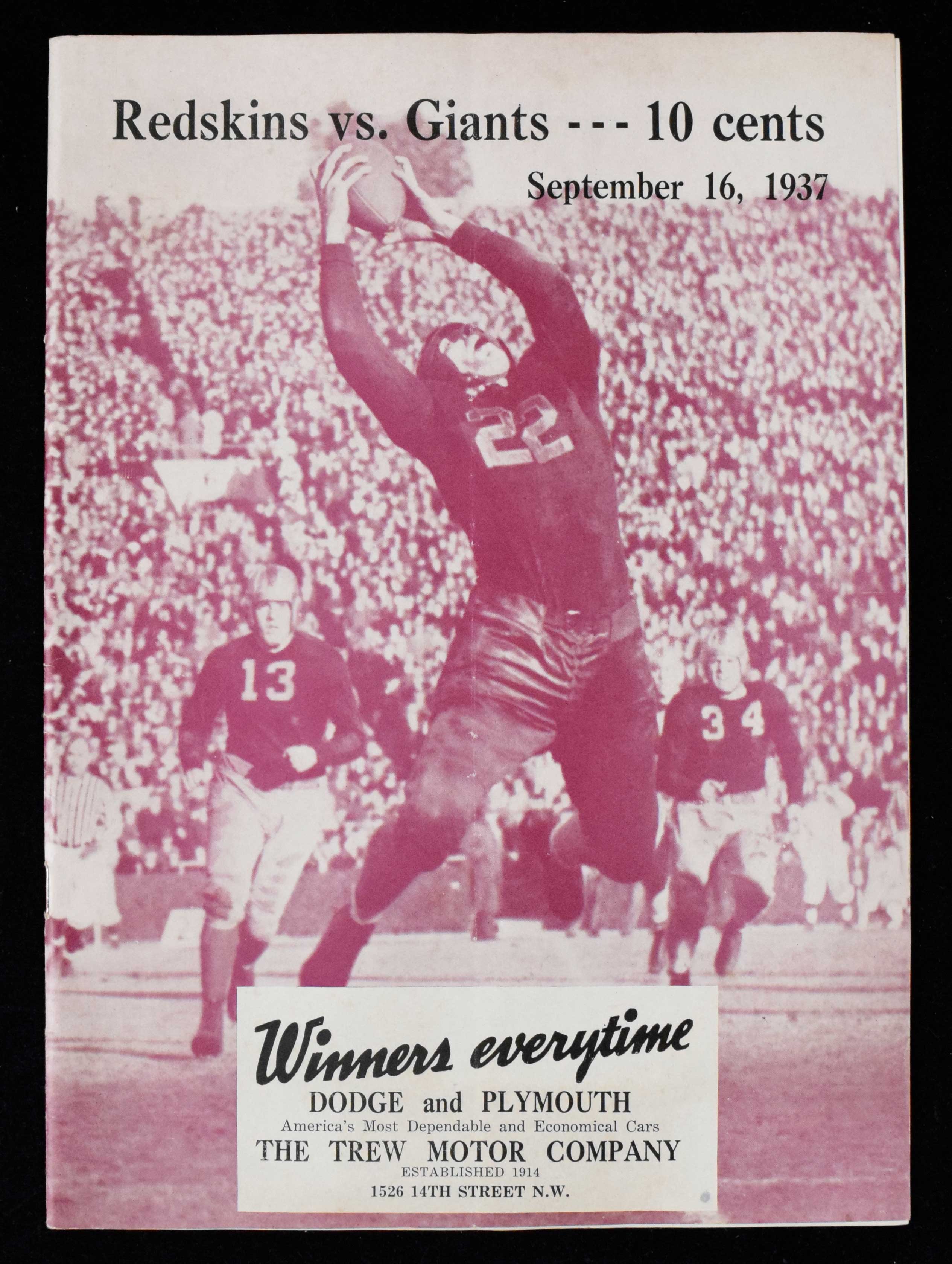 Description:1937 New York Giants at Washington Redskins season opener program - Sammy Baugh 1st NFL game (EX). September 16th Griffith Stadium program from game in which the Redskins defeated the Giants by a score of 13-3. Sammy Baugh went 11-16 for 114-yards passing and added 27-yards rushing in his NFL debut. Very light vertical fold crease, and tear to one of the interior page corners: EX