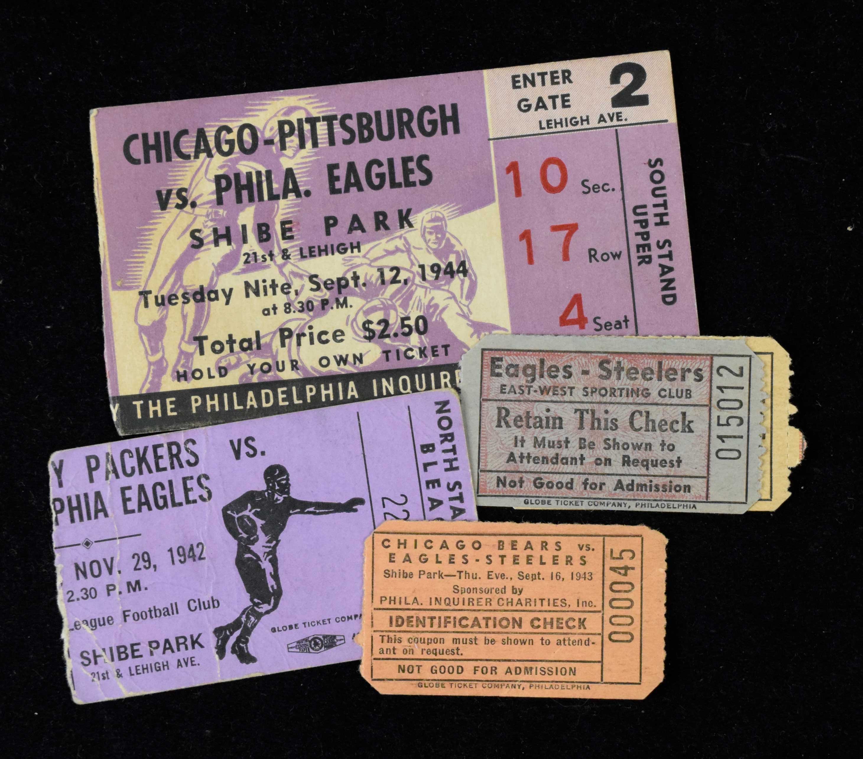 Description:Lot of (5) NFL tickets, etc. from 1942-1944 including Steagles (see description). Includes 11/29/1942 Green Bay Packers at Philadelphia Eagles ticket stub (GD), 9/16/1943 Chicago Bears at Phi/Pit Eagles-Steelers "Identification Check" ticket (GD), (2) other 1943 Eagles-Steelers "Check" tickets (GD-EX no game dates), and 9/12/1944 Chi/Pit Cards-Steelers at Eagles ticket stub (EX).