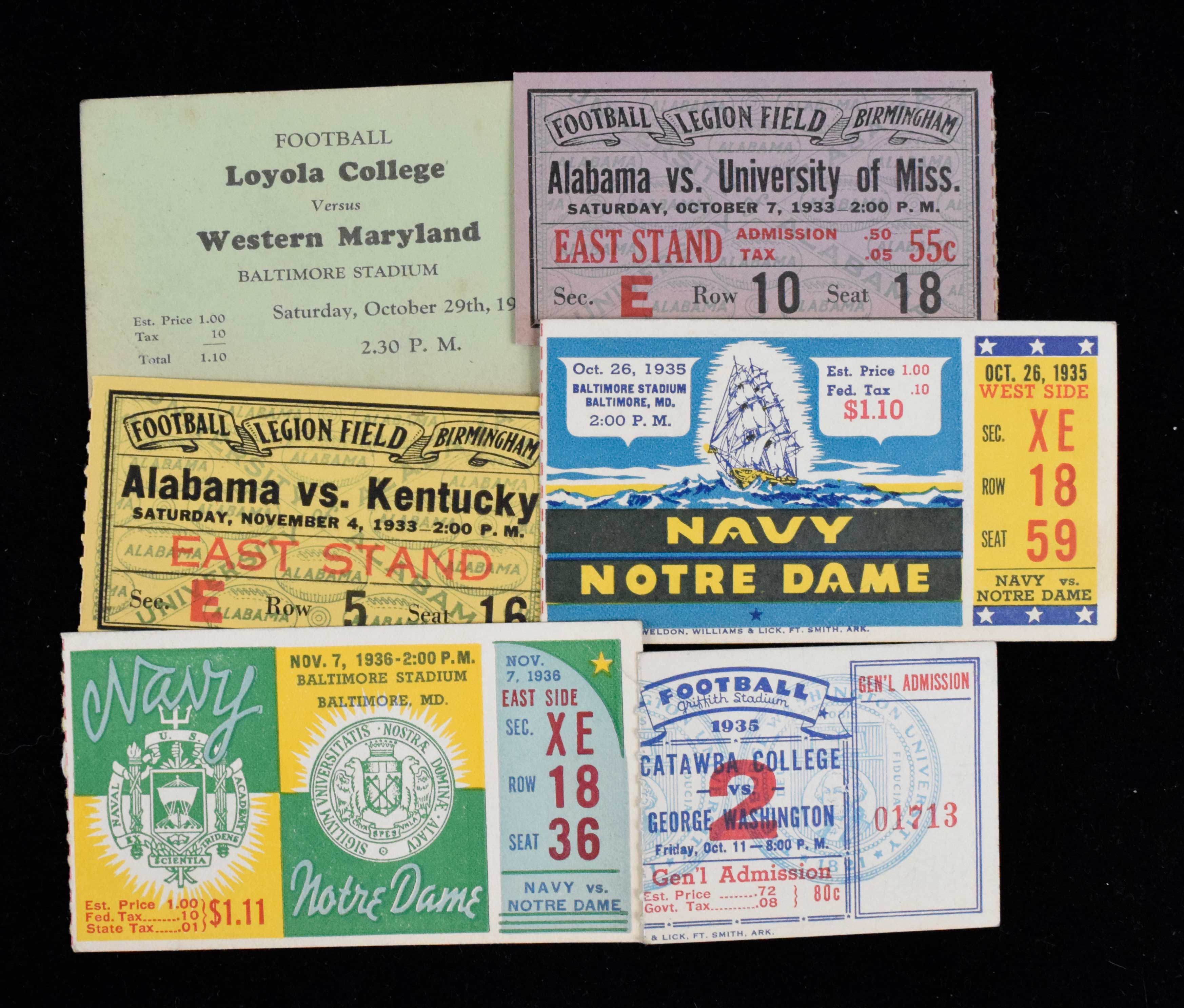 Description:Lot of (15) college football ticket stubs from 1932-1936 (GD-EX/MT). Includes 10/29/1932 Loyola College at Western Maryland, 11/19/1932 Baltimore Tech vs Baltimore City College, 12/3/1932 Maryland at Western Maryland, 10/7/1933 Mississippi at Alabama, 11/4/1933 Kentucky at Alabama, 11/29/1934 Maryland at Johns Hopkins, 9/27/1935 Emory & Henry College at George Washington, 10/11/1935 Catawba College at George Washington, 10/18/1935 West Virginia at George Washington, 10/26/1935 Notre Dame at Navy, 11/8/1935 Davis-Elkins College at George Washington, 10/9/1936 Mississippi at George Washington, 10/17/1936 Yale at Navy, 11/7/1936 Notre Dame at Navy, and 11/21/1936 Baltimore City College at Baltimore Tech. Most appear to average VG-VG/EX overall. Range: GD-EX/MT