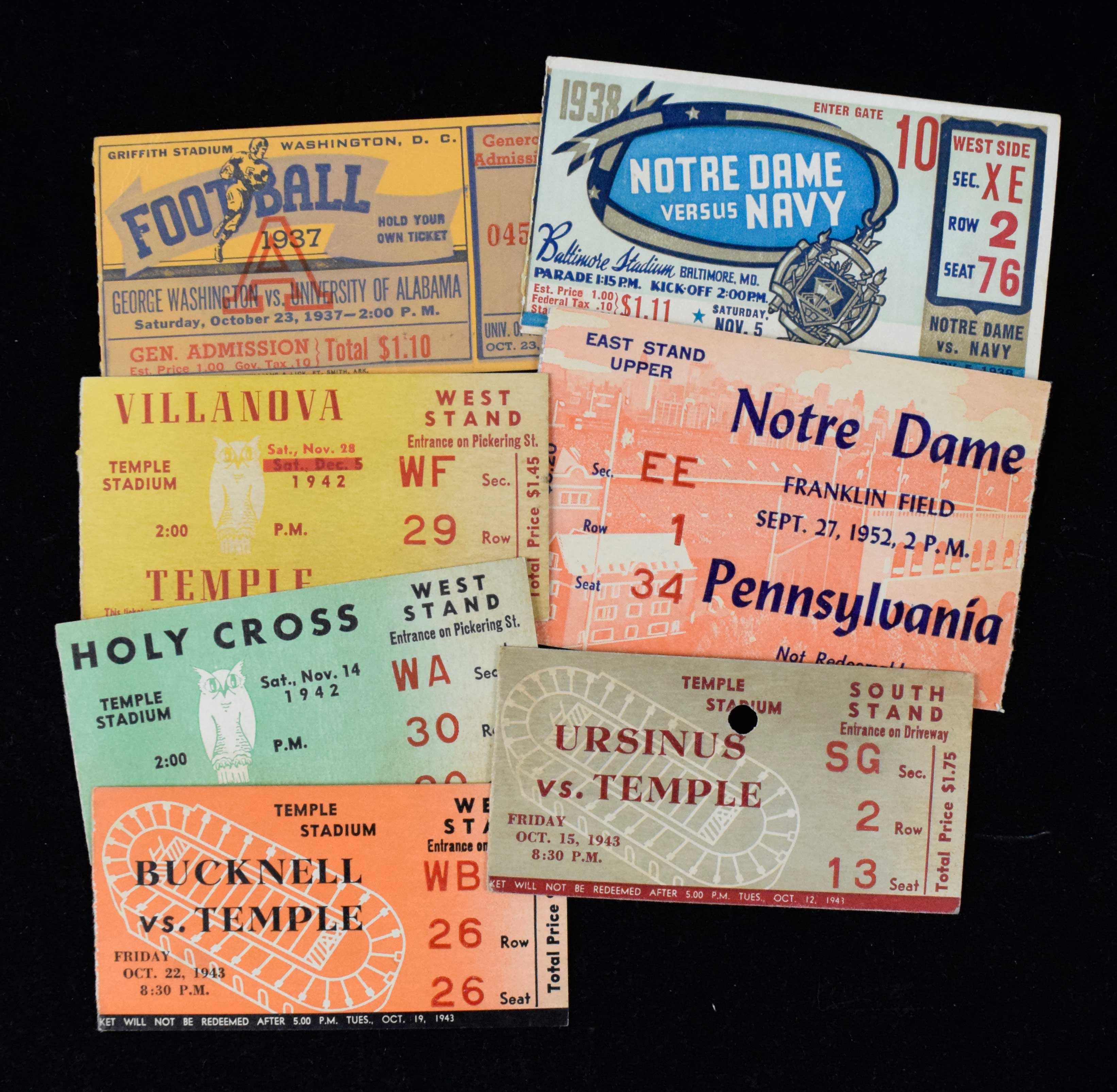 Description:Lot of (14) college football ticket stubs from 1937-1952 (GD-EX/MT). Includes 10/23/1937 Alabama at George Washington, 11/20/1937 Baltimore City College at Baltimore Tech, 11/5/1938 Notre Dame at Navy, 11/14/1942 Holy Cross at Temple, 11/28/1942 Villanova at Temple, 9/25/1943 Princeton at Pennsylvania, 10/2/1943 Yale at Penn, 10/15/1943 Ursinus at Temple, 10/22/1943 Bucknell at Temple, 11/6/1943 Navy at Penn, 11/20/1943 Villanova at Temple, 9/27/1952 Notre Dame at Penn, 10/25/1952 Navy at Penn, and 11/22/1952 Boston University at Villanova. Most appear to average VG/EX overall. Range: GD-EX/MT