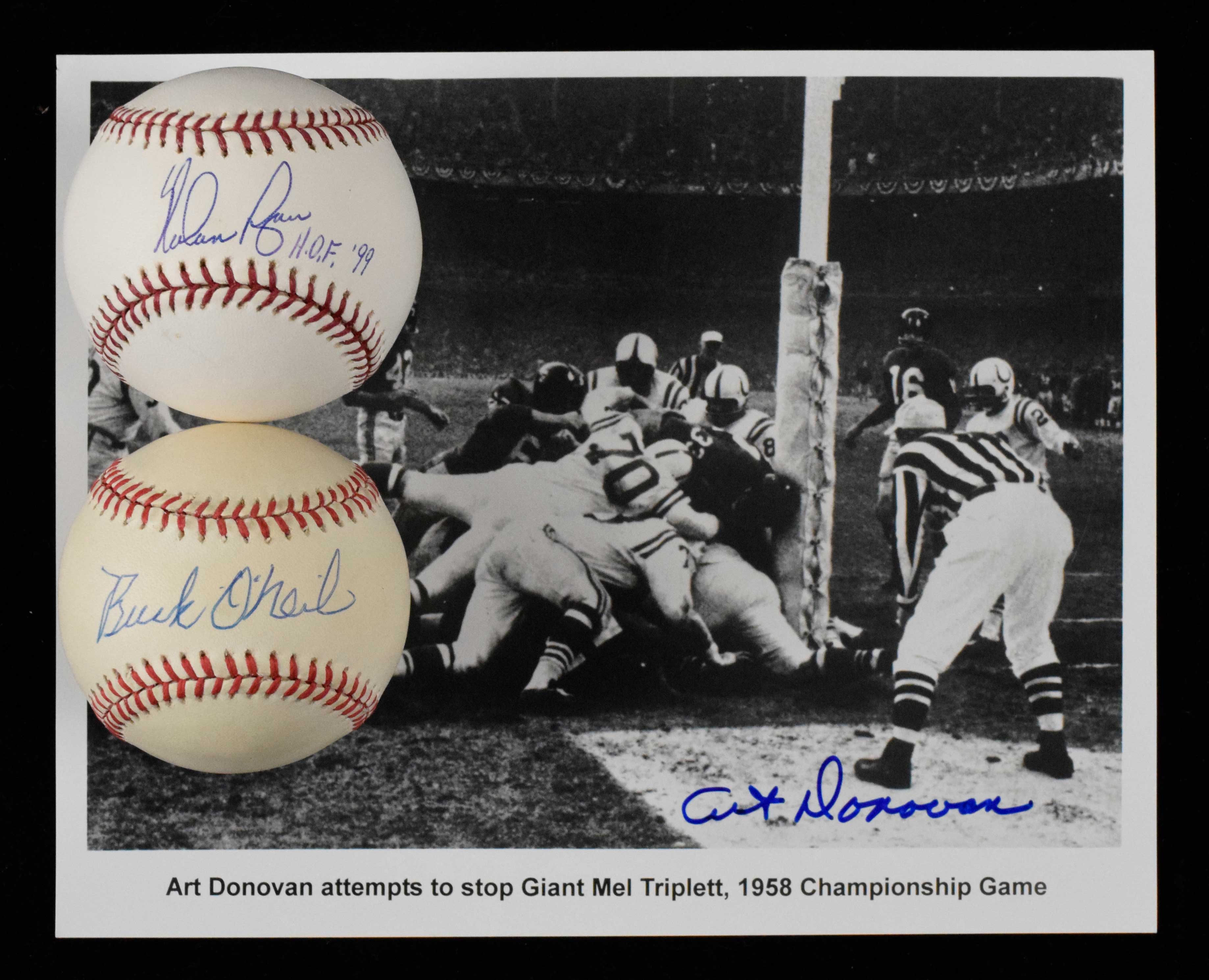 Description:Baseball and football autograph lot with some stars and HOFers (EX-NM/MT). Includes B.Selig ML ball signed by Nolan Ryan with "HOF 99" inscription (Ryan authenticated), G.Budig AL ball (light toning) signed by Buck O'Neil, South Atlantic League ball signed by Alex Rodriguez, B.Brown AL ball (toning) signed by Juan Gonzalez, 8"x10" photo signed by Art Donovan, and 8"x10" photo signed by William Henderson. Signatures rate 7 (Henderson) to 10 (avg 8) out of 10: EX-NM/MT