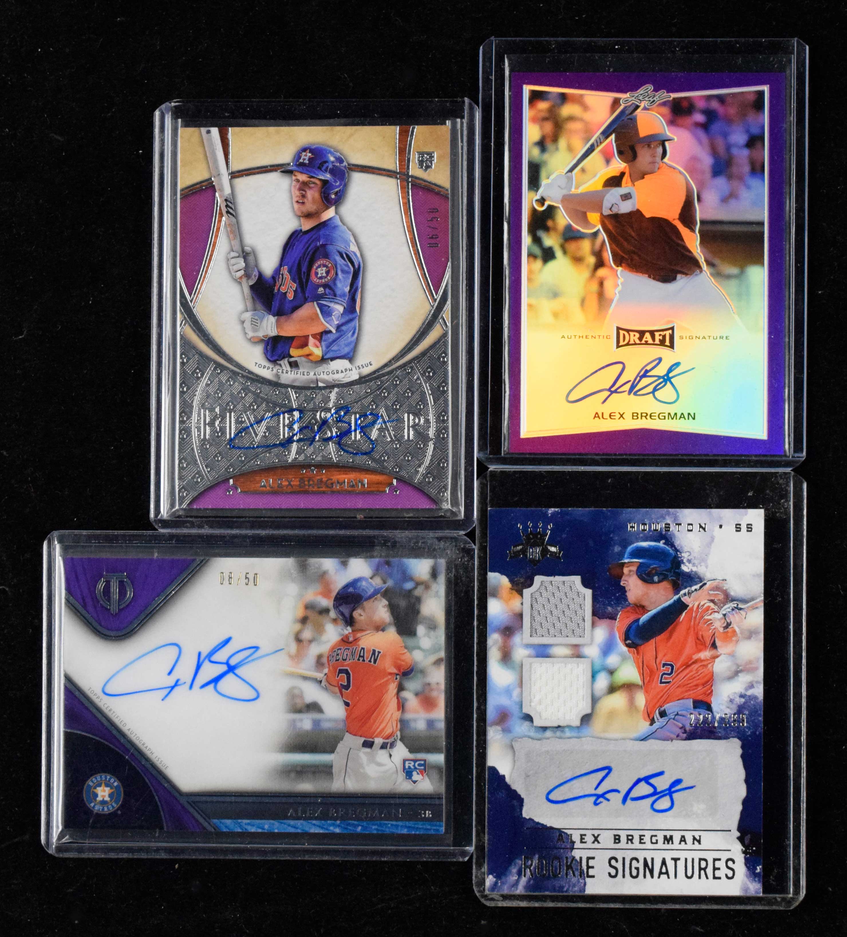 Description:Lot of (4) Alex Bregman signed serial numbered insert cards (NM-NM/MT). Includes 2016 Leaf Metal Draft "Purple Prismatic" #BA-AB1 signed by Bregman (#ed 11/20), 2017 Topps Five Star "Autograph Purple" #FSA-ABR signed by Bregman (#ed 6/50), 2017 Topps Tribute "Autographs Purple" #TA-AB signed by Bregman (#ed 8/50), and 2017 Panini Diamond Kings "Rookie Signatures" #RS-AX double relic card signed by Bregman (#ed 222/299). Signatures rate 8/9 to 10 out of 10: NM-NM/MT
