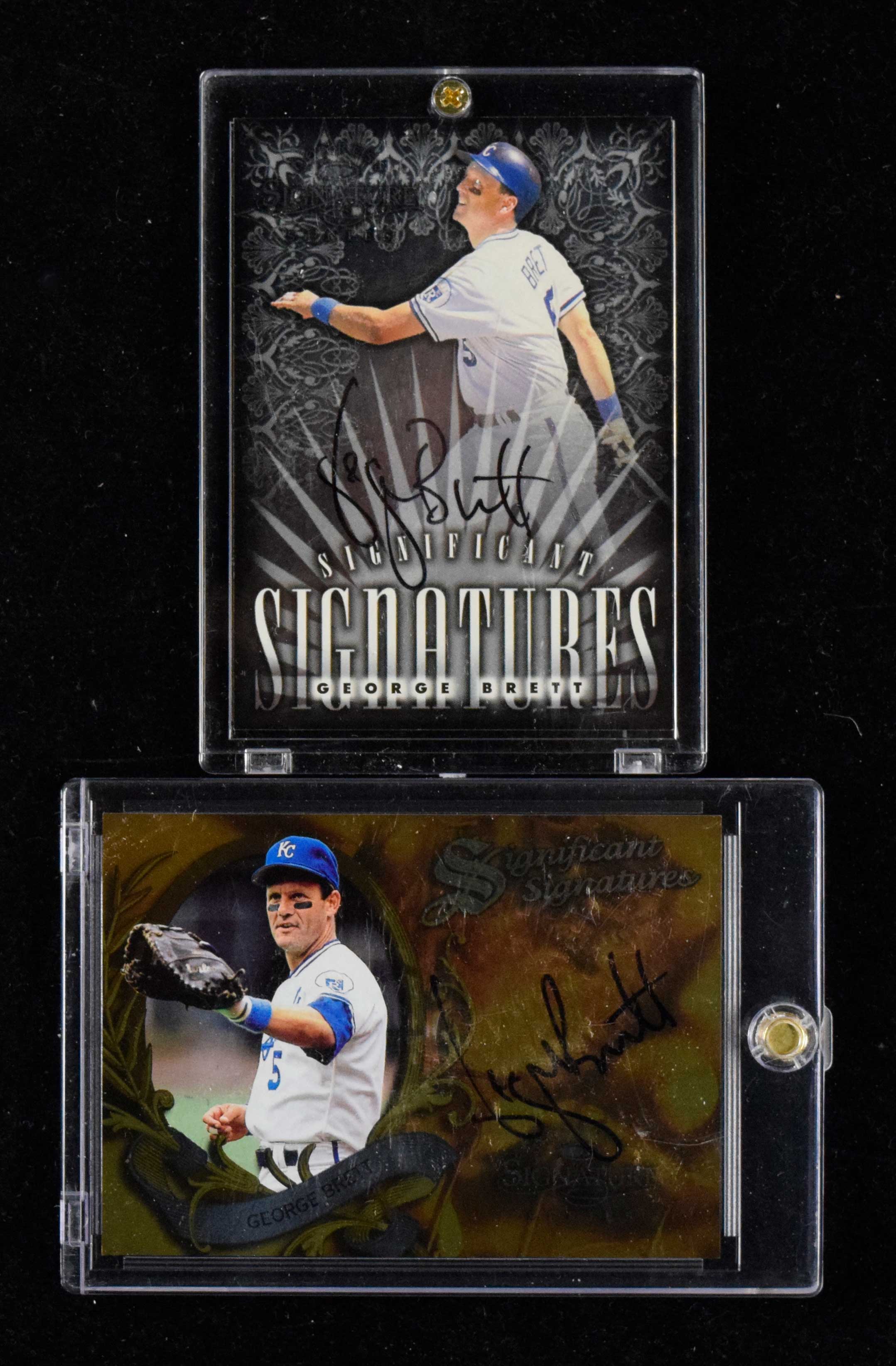 Description:George Brett signed 1997 and 1998 Donruss Signature Series serial #ed insert cards (NM-NM/MT). Includes 1997 Donruss Signature Series "Significant Signatures" signed by Brett (#ed 1006/2000), and 1998 Donruss Signature Series "Significant Signatures" signed by Brett (#ed 993/2000). Signatures rate 9 to 10 out of 10: NM-NM/MT