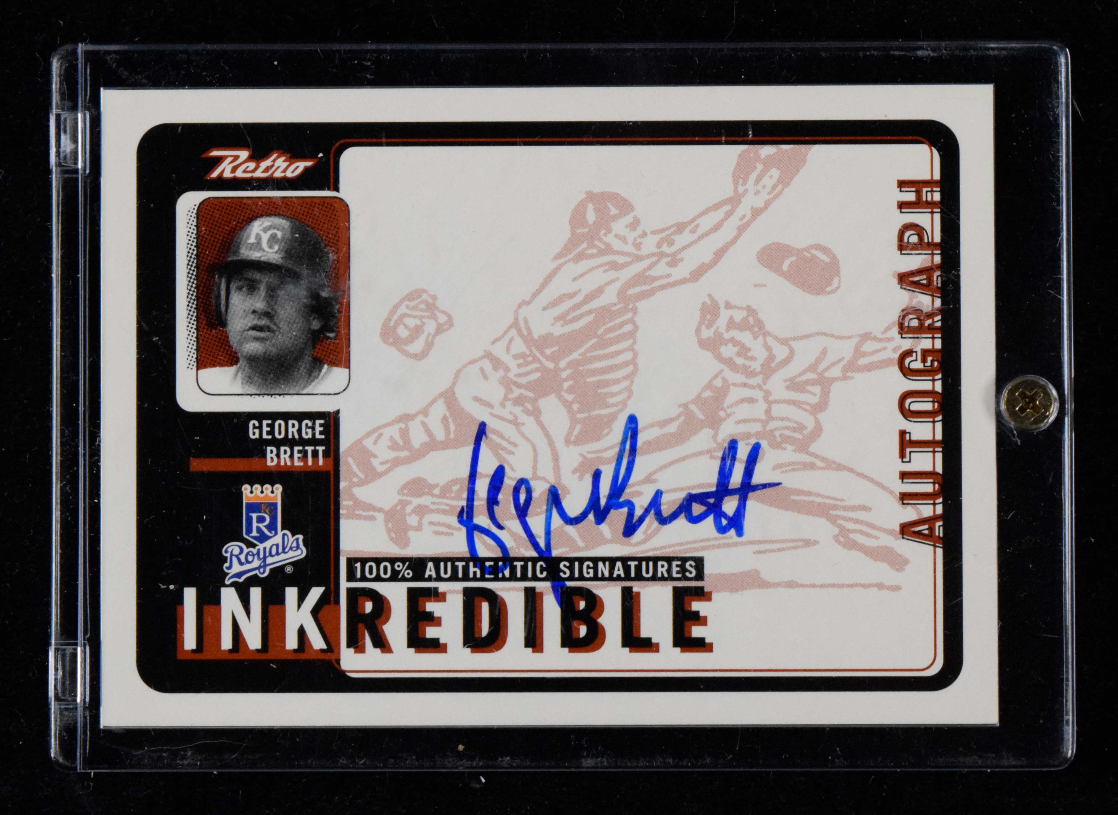 Description:George Brett signed 1999 Upper Deck Retro short print insert card (NM). 1999 Upper Deck Retro "Inkredible" #GB signed by Brett in blue marker. Signature rates 9/10 out of 10: NM