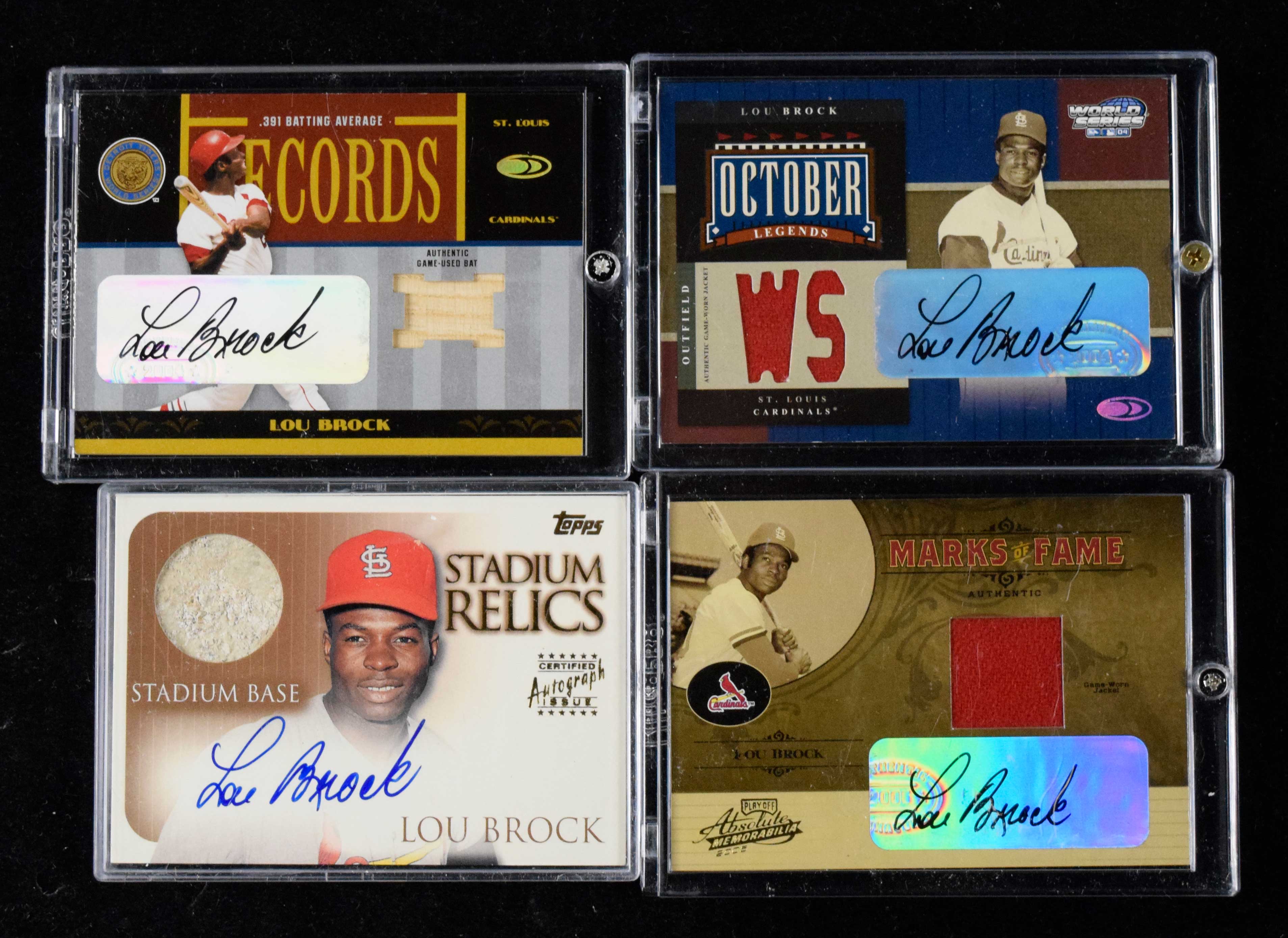 Description:Lot of (4) Lou Brock signed relic insert cards (NM-NM/MT). Includes 2000 Topps "Stadium Relics" #SR7 signed by Brock, 2004 Donruss World Series "October Legends Signature Material" #OL-11 signed by Brock (#ed 28/100), 2004 Donruss World Series "Records Signature Material" #RECORDS-1 signed by Brock (#ed 40/100), and 2005 Playoff Absolute Memorabilia "Marks of Fame Autograph Swatch" #MF-20 signed by Brock (#ed 49/125). Signatures rate 8/9 to 10 out of 10: NM-NM/MT