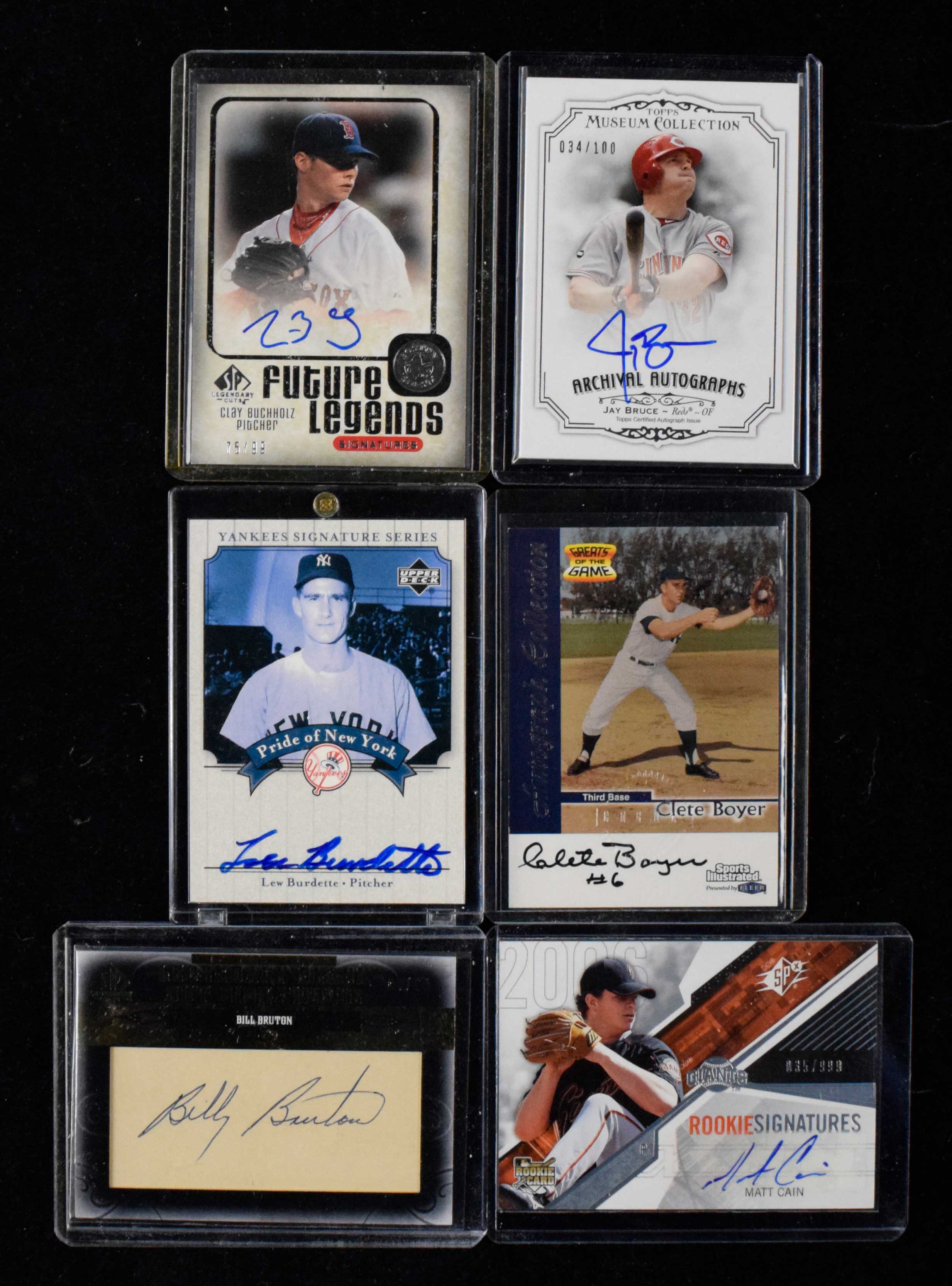 Lot of (49) signed baseball insert cards (NM-NM/MT overall). Includes (3) Clete Boyer, Lou Burdette, Billy Bruton (#ed 4/15), Bert Campaneris (#ed 7/15), Dennis "Oil Can" Boyd, (7) Jay Bruce, (3) Byron Buxton, (6) Matt Cain, (7) Clay Buchholz, (6) Billy Butler, Jackie Bradley Jr, Archie Bradley, (3) Melky Cabrera, (4) Taylor Buchholz, (2) Ryan Braun (pitcher), and (2) Billy Buckner. Signatures rate 6/7 (one Clay Buchholz) to 10 (avg 9) out of 10: NM-NM/MT overall