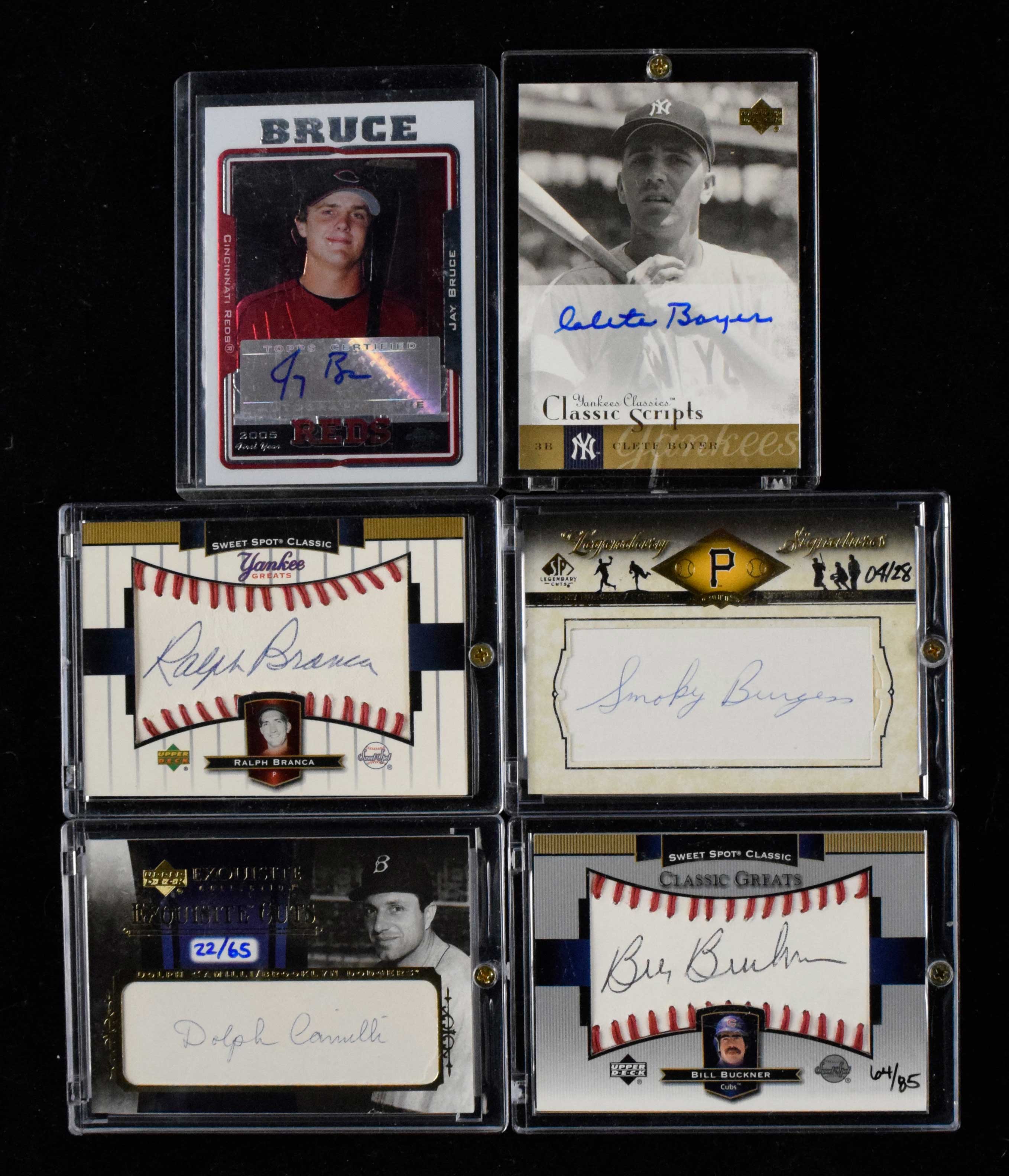 Description:Lot of (49) signed baseball insert cards (NM-NM/MT overall). Includes (2) Bill Buckner, Smoky Burgess (#ed 4/28), Dolph Camilli (#ed 22/65), (2) Cleye Boyer, (2) Ralph Branca, (8) Jay Bruce, Oil Can Boyd (#ed 22/99), (3) Byron Buxton, (6) Billy Butler, (6) Matt Cain, (6) Clay Buchholz, Jackie Bradley Jr, (3) Melky Cabrera, (4) Taylor Buchholz, (2) Ryan Braun (pitcher), and Billy Buckner. Signatures rate 8 to 10 out of 10: NM-NM/MT overall