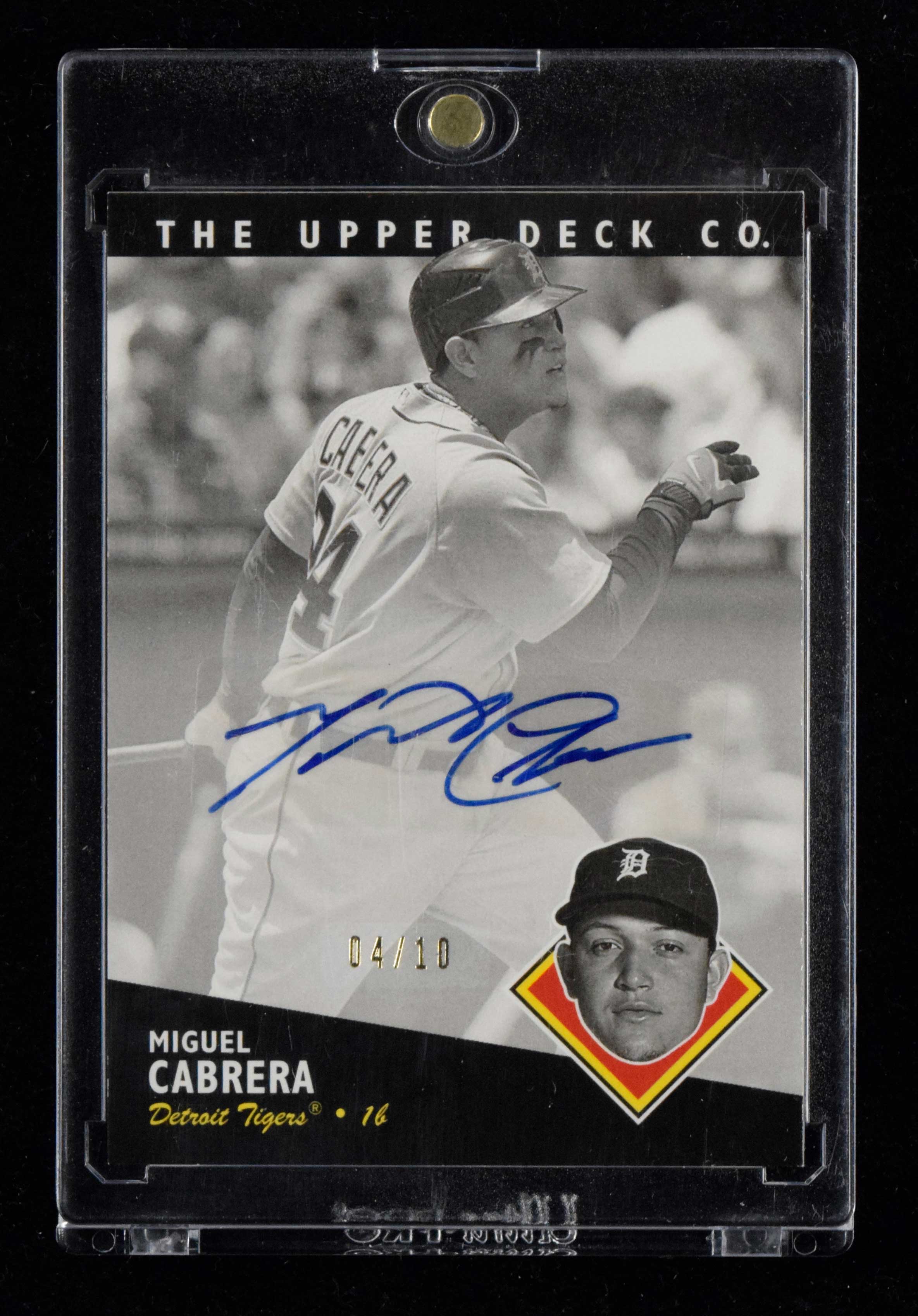 Description:Miguel Cabrera signed 2008 Upper Deck Timeline insert card #ed 4/10 (NM/MT). 2008 Upper Deck Timeline "All-Time Heroes Autographs" #165 signed by Cabrera in blue marker. Signature rates 10 out of 10. The card is numbered 4/10: NM/MT