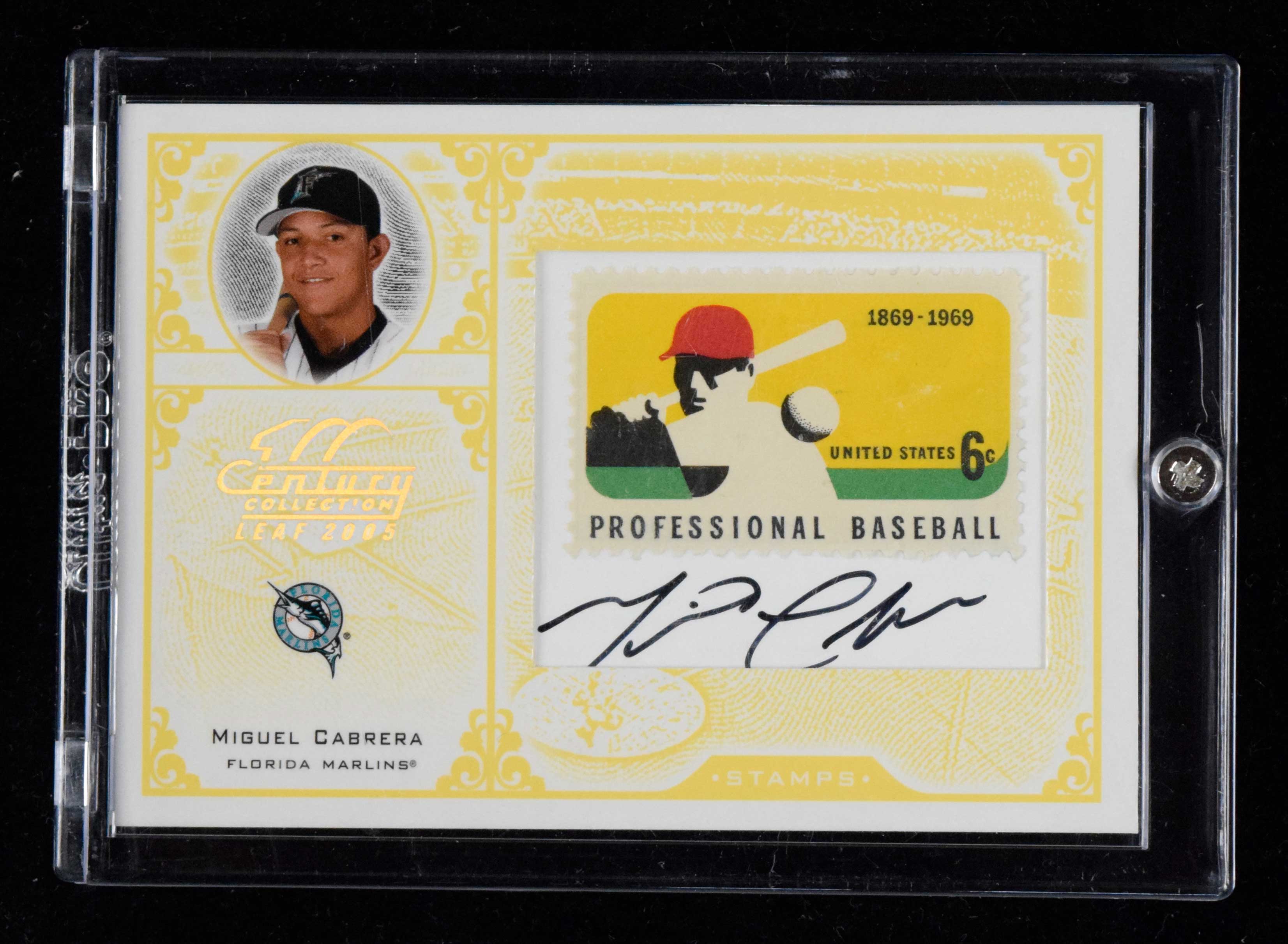 Description:Miguel Cabrera signed 2005 Leaf Century insert card #ed 23/24 (NM). 2005 Leaf Century "Stamps Signature Professional Baseball" #S-65 signed by Cabrera in black marker. Signature rates 9 out of 10. The card is numbered 23/24: NM