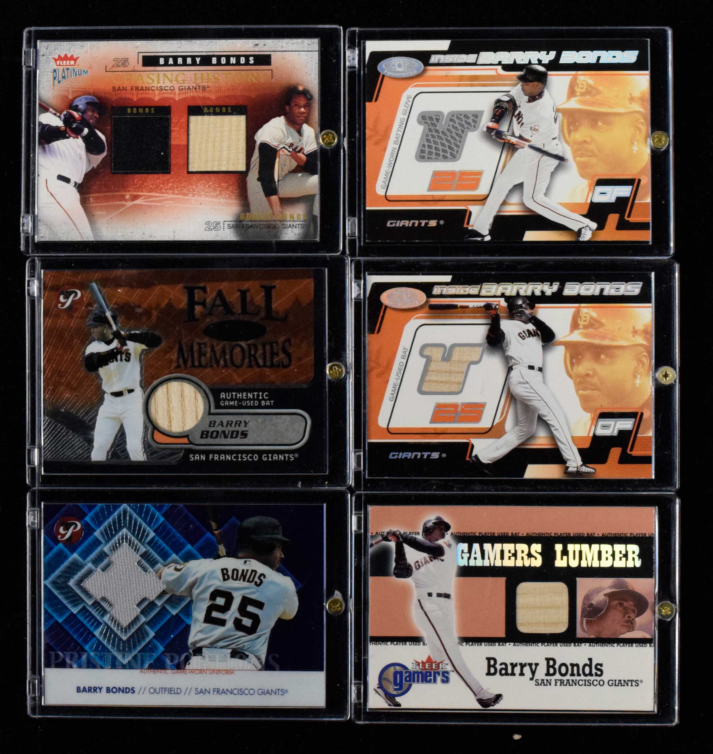 Lot of (15) Barry Bonds game used relic swatch insert cards (NM-NM/MT overall). Includes 2000 Fleer Gamers "Lumber" Bonds bat card, 2001 Donruss Studio "Diamond Collection" #DC-2 Bonds jersey card, 2001 Pacific Private Stock "Game-Used Gear" #150 Bonds jersey card, 2001 SP Game Bat Milestone "Piece of the Action Bound for the Hall" #B-BB Bonds bat card, 2001 SP Game Bat Milestone "Piece of the Action Milestone" #M-BB Bonds bat card, 2001 Upper Deck Sweet Spot "Game Jersey" #J-BB Bonds jersey card, 2002 Topps Finest "Bats" #FRB-BB Bonds bat card, 2002 Topps Pristine "Fall Memories" #FM-BB Bonds bat card (#ed 423/425), 2002 Topps Pristine "Portions" #PP-BBO Bonds jersey card (#ed 723/2400), 2002 Fleer Authentix "Jersey AuthenTIX Ripped" #JA-BB Bonds jersey card, 2002 Fleer Box Score "Classic Miniatures Game Used" #10 Bonds bat card, 2002 Fleer Hot Prospects "Inside Barry Bonds Memorabilia" #s 4 Bonds bat card (#ed 422/700) and 7 Bonds batting glove card (#ed 393/400), 2003 Topps Pristine "Bonds Dual Relics" #PBB-BR Bonds / Alex Rodriguez relics card, and 2003 Fleer Platinum "Barry Bonds Chasing History Game Used" #BB-BB Barry Bonds / Bobby Bonds relics card (#ed 206/250): NM-NM/MT overall
