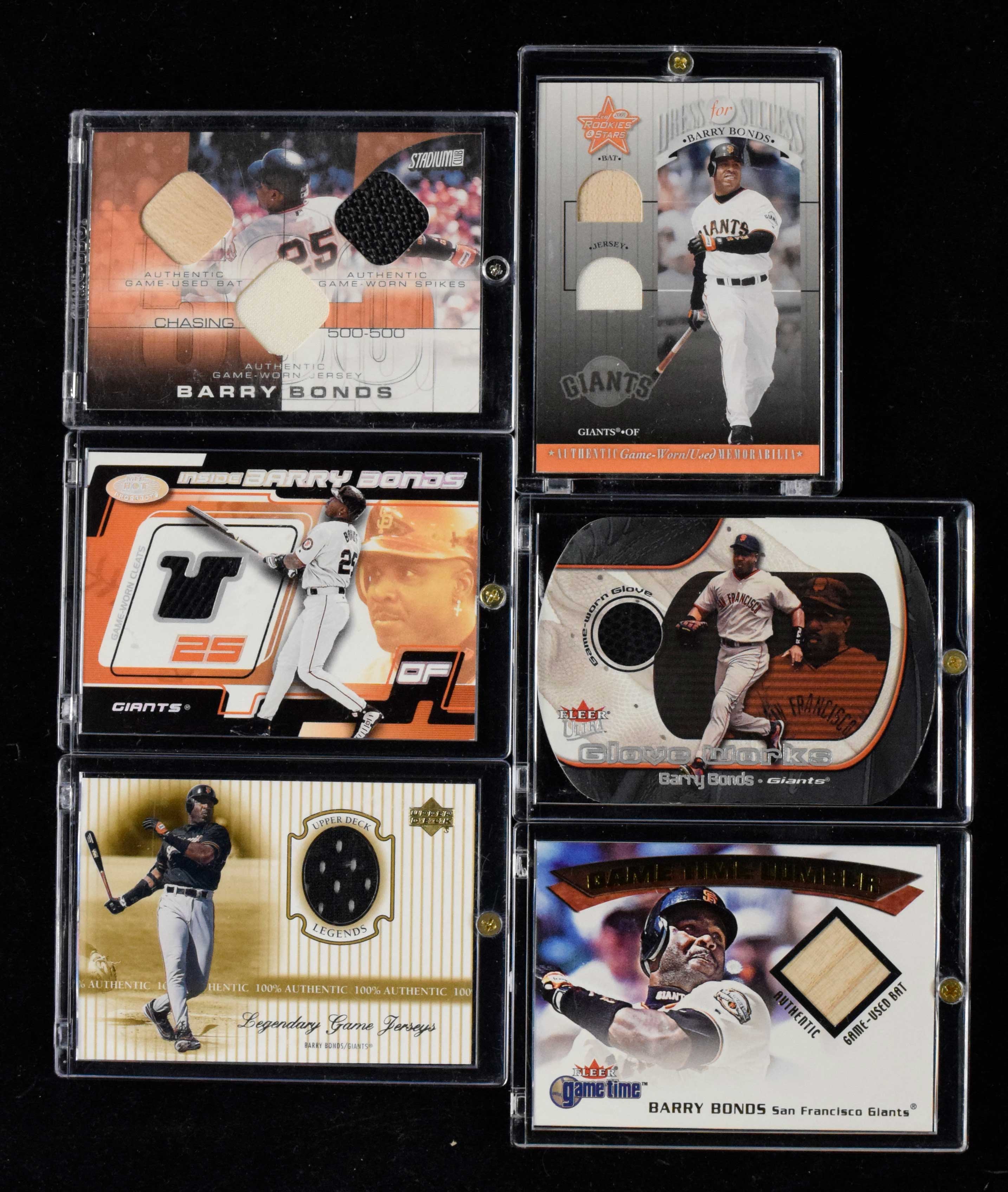 Lot of (15) Barry Bonds game used relic swatch insert cards (NM-NM/MT overall). Includes 2000 Upper Deck Legends "Legendary Game Jerseys" #J-BaB Bonds jersey card, 2001 Donruss Elite "Throwback Threads" #TT-32 Bonds / Willie McCovey relics card (#ed 19/50), 2001 Fleer Game Time "Lumber" Bonds bat card, 2001 Fleer Legacy "MLB Game Issue" Bonds base card, 2001 Fleer Platinum "Lumberjacks" Bonds bat card, 2001 Leaf Rookies & Stars "Dress for Success" #DFS-3 Bonds bat/jersey card, 2001 Upper Deck Pros & Prospects "Specialty Jerseys" #S-BB Bonds jersey card, 2001 Upper Deck Rookie Update "SPx Update Winning Materials Trios" #KBA Bonds / Jeff Kent / Rich Aurilia relics card, 2002 Topps Stadium Club "Chasing 500-500" #C55-BB Bonds bat/spikes/jersey card (#ed 19/200), 2002 Topps Heritage "Clubhouse Collection" #CC-BB Bonds bat card, 2002 Bowman Heritage "Relics" #BH-BB Bonds jersey card, 2002 Fleer Hot Prospects "Inside Barry Bonds Memorabilia" #s 3 Bonds jersey card (#ed 538/800) and 6 Bonds cleats card (#ed 415/500), 2002 Fleer Tradition "This Day in History Game Used" Bonds bat card (production run of 250), and 2002 Fleer Ultra "Glove Works Memorabilia" Bonds glove card (#ed 148/450): NM-NM/MT overall