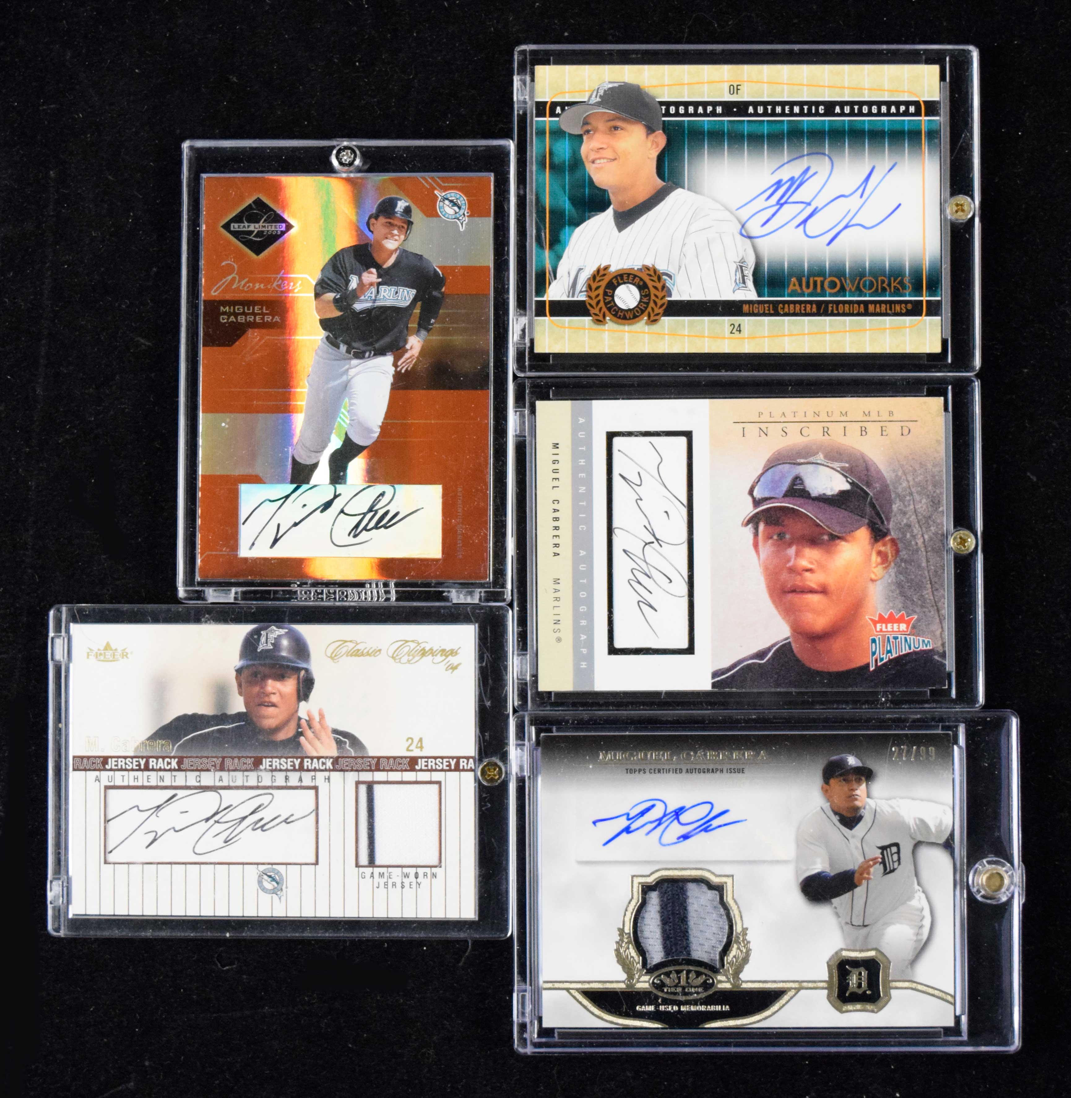Description:Lot of (5) Miguel Cabrera signed serial numbered insert cards (NM-NM/MT). Includes 2004 Fleer Classic Clippings "Jersey Rack Autograph Bronze" #JRA-MC signed by Cabrera (#ed 47/149), 2004 Fleer Platinum "Inscribed" #I-MC signed by Cabrera (#ed 61/200), 2005 Fleer Patchworks "Autoworks Copper" #AW-MC signed by Cabrera (#ed 75/75), 2005 Leaf Limited "Monikers Bronze" #10 signed by Cabrera (#ed 63/100), and 2013 Topps Tier One "Autograph Relics" #TOAR-MC signed by Cabrera (#ed 27/99). Signatures rate 8/9 to 10 out of 10: NM-NM/MT