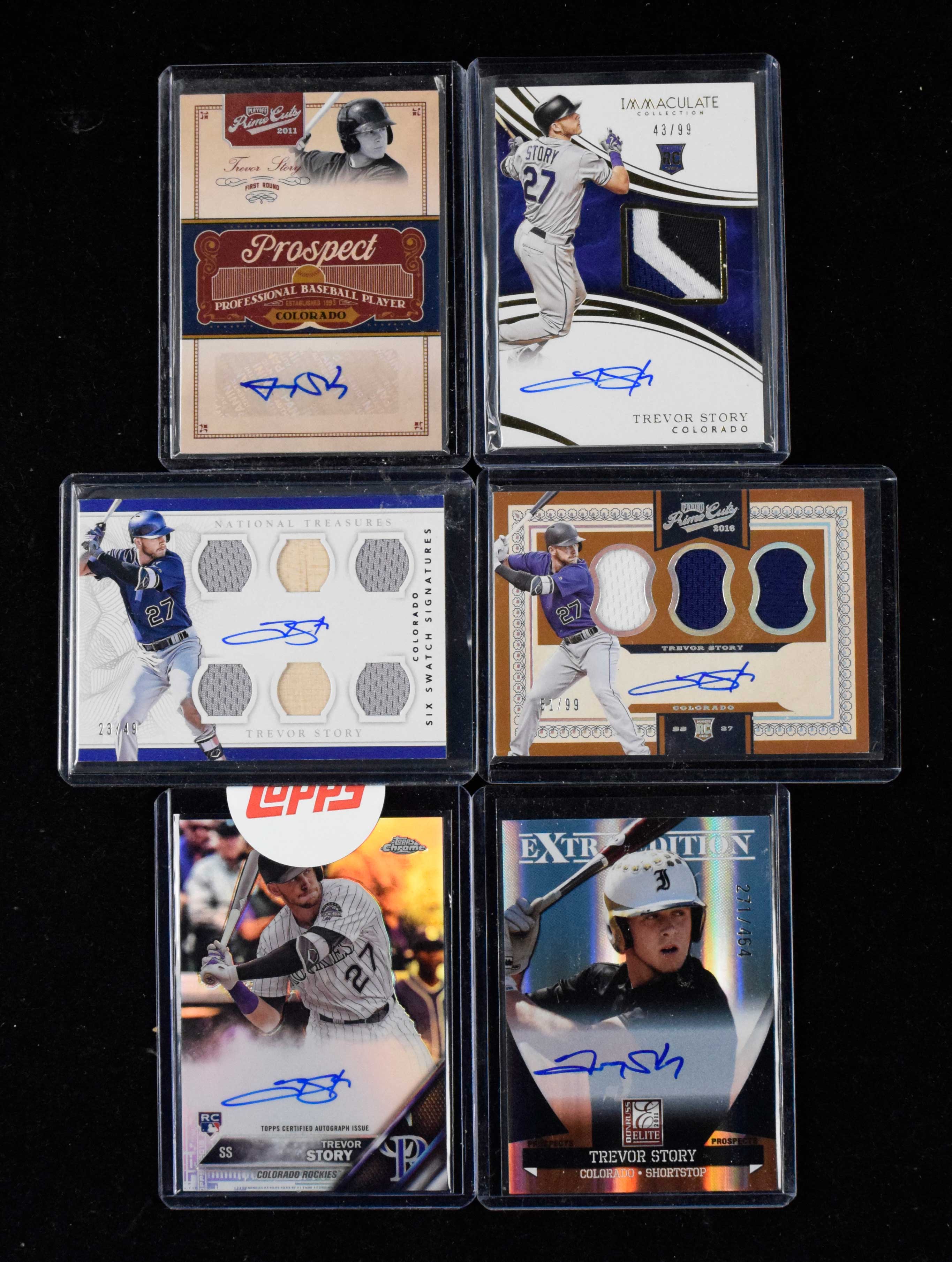 Description:Lot of (14) Trevor Story signed insert cards including rookies, serial #ed, and relics (NM-NM/MT overall). Includes 2011 Bowman Draft Picks & Prospects "Chrome Prospect Autographs" #BCAP-TS signed by Story, 2011 Donruss Elite Extra Edition "Prospects Signature" #P-49 signed by Story (#ed 271/464), 2011 Panini Prime Cuts "Prospect Signatures" #TS signed by Story (#ed 145/299), 2011 Panini Prime Cuts "Prospect Signatures Silver" #TS signed by Story (#ed 82/99), 2016 Topps Chrome "Rookie Autographs Refractor" #RA-TS signed by Story (#ed 493/499), 2016 Topps Five Star "Autographs" #FSA-TS signed by Story, 2016 Topps High Tek "Autographs" #HT-TS signed by Story, 2016 Bowman's Best "Best of 2016 Autographs" #B16-TS signed by Story, 2016 Panini Immaculate Collection #125 patch card signed by Story (#ed 43/99), 2016 Panini National Treasures "Six Swatch Signatures Purple" #SSS-TS signed by Story (#ed 23/49), 2016 Donruss Optic "Autographs" #OA-TS signed by Story, 2016 Panini Prime Cuts #54 triple relic card signed by Story (#ed 51/99), 2017 Topps Tier One "Break Out Autographs" #BOA-TSO signed by Story (#ed 3/140), and 2017 Topps Tribute "Autographs" #TA-TS signed by Story (#ed 119/199). Signatures rate 8 to 10 out of 10: NM-NM/MT overall