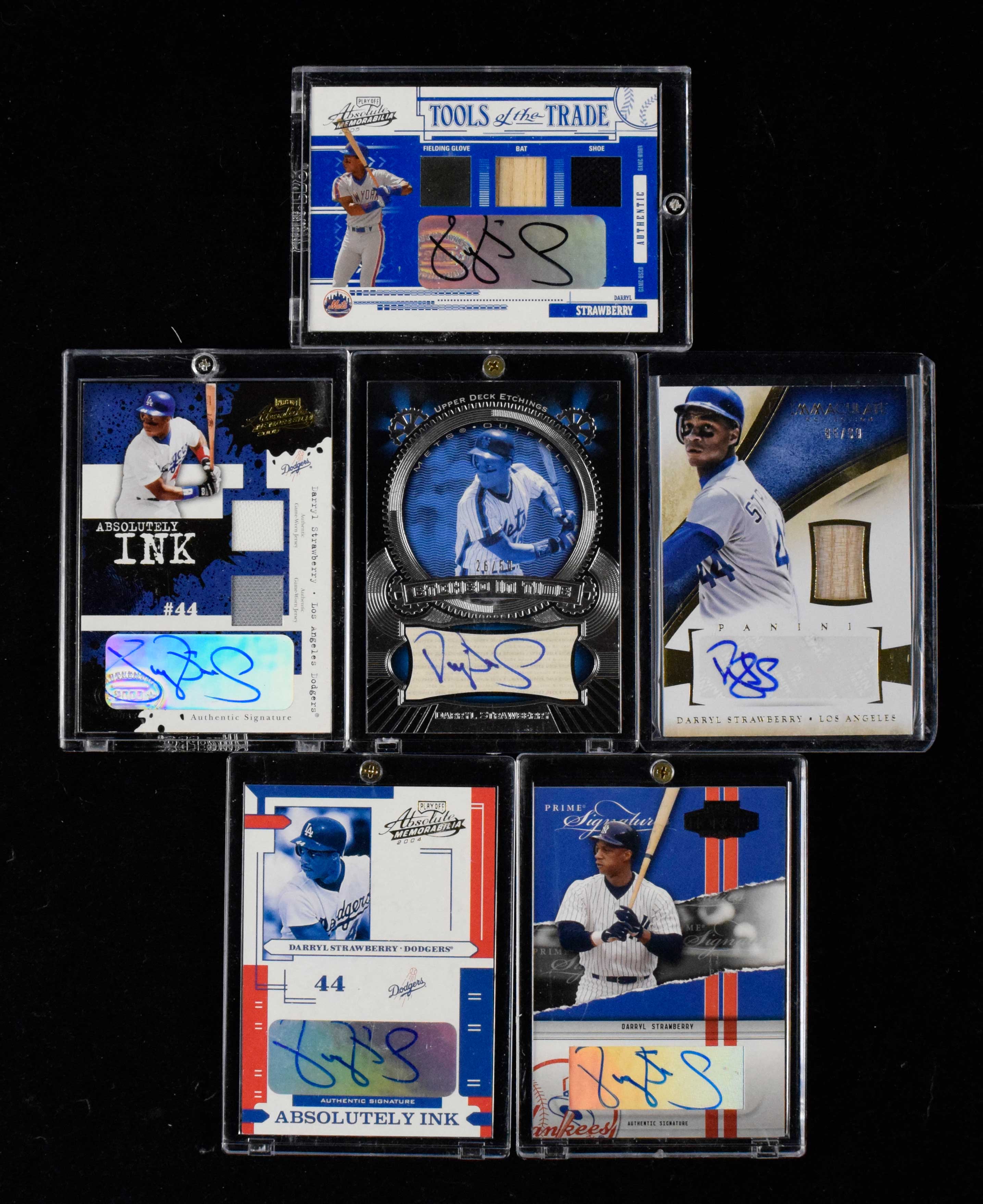 Description:Lot of (9) Darryl Strawberry signed insert cards including serial #ed and relics (NM-NM/MT). Includes 2004 Donruss Timelines "Boys of Summer Autograph" #9 signed by Strawberry, 2004 Playoff Absolute Memorabilia "Absolutely Ink" #AI-34 signed by Strawberry (#ed 43/100), 2004 Playoff Honors "Prime Signature Autograph" #PS-31 signed by Strawberry (#ed 20/100), 2004 Upper Deck Etchings "Etched in Time Autograph Blue" #ET-DS signed by Strawberry (#ed 26/50), 2004 Upper Deck Yankees Classics "Classic Scripts 2" #CS dual-signed by Strawberry and David Cone (#ed 35/100), 2005 Donruss Greats "Signatures Gold HoloFoil" #13 signed by Strawberry, 2005 Playoff Absolute Memorabilia "Absolutely Ink Swatch Double" #AI-27 signed by Strawberry (#ed 12/50), 2005 Playoff Absolute Memorabilia "Tools of the Trade Autograph Swatch Triple Prime" #TI-18 signed by Strawberry (#ed 49/50), and 2014 Panini Immaculate Collection "Autograph Materials" #7 signed by Strawberry (#ed 85/99). Signatures rate 8 to 10 out of 10: NM-NM/MT