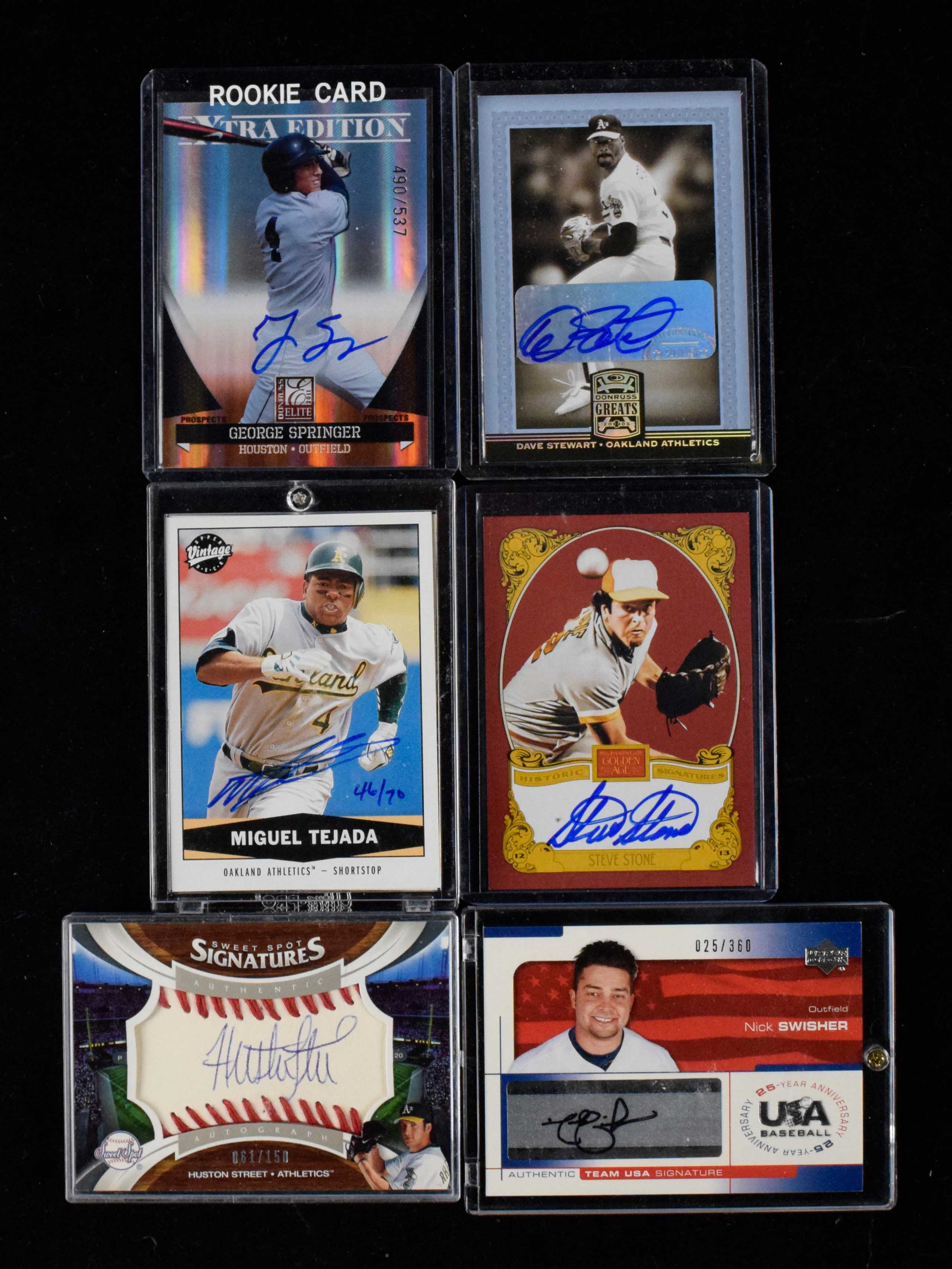 Description:Lot of (42) signed baseball insert cards (NM-NM/MT overall). Includes (5) George Springer, (6) Miguel Tejada, Dave Stewart, Steve Stone, (9) Huston Street, (10) Nick Swisher, (3) Matt Szczur, and (7) Kurt Suzuki. Signatures rate 7/8 to 10 (avg 9) out of 10: NM-NM/MT overall