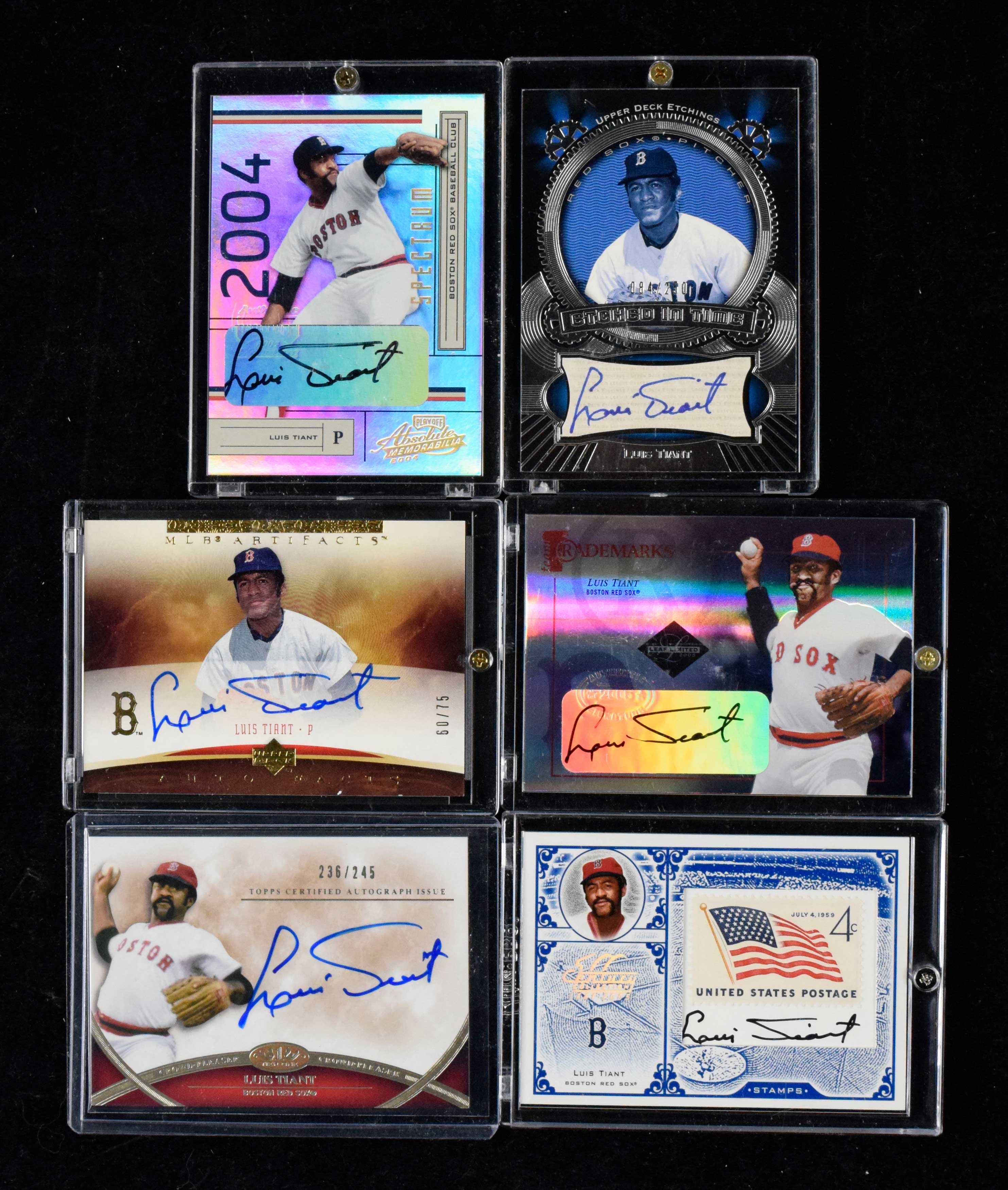 Description:Lot of (16) Luis Tiant signed insert cards including serial numbered (NM-NM/MT overall). Incl. 2003 Topps Retired Signature Edition "Autographs" #TA-LT signed by Tiant, 2003 Upper Deck Yankees Signature Series "Pride of New York Autos" #PN-LT signed by Tiant, 2004 Topps Retired Signature Edition "Autographs" #TA-LT signed by Tiant, 2004 Fleer Greats of the Game "Autographs" #GBA-LT signed by Tiant, 2004 Playoff Absolute Memorabilia "Signature Spectrum Gold" #40 signed by Tiant (#ed 9/50), 2004 Upper Deck Etchings "Etched in Time Autograph Blue" #ET-LT signed by Tiant (#ed 84/250), 2004 Upper Deck Legends Timeless Teams "Autographs" #189 signed by Tiant, 2004 Upper Deck Yankees Classics "Classic Scripts" #AU-45 signed by Tiant, 2005 Donruss Greats "Signatures Gold HoloFoil" #54 signed by Tiant, 2005 Leaf Century "Stamps Signature USA Flag" #S-66 signed by Tiant (#ed 30/100), 2005 Leaf Limited "Team Trademarks Signature" #TT-35 signed by Tiant (#ed 1/50), 2005 Upper Deck Artifacts "Auto Facts" #LT signed by Tiant (#ed 60/75), 2005 Upper Deck Sweet Spot Classic "Signatures" #LT signed by Tiant, 2005 Upper Deck Ultimate Signature Edition "Decades" #SD-LT1 signed by Tiant, 2006 Fleer Greats of the Game "Autographs" #62 signed by Tiant, and 2012 Topps Tier One "Crowd Pleaser Autographs" #CPA-LT signed by Tiant (#ed 236/245). Signatures rate 8 to 10 out of 10: NM-NM/MT overall