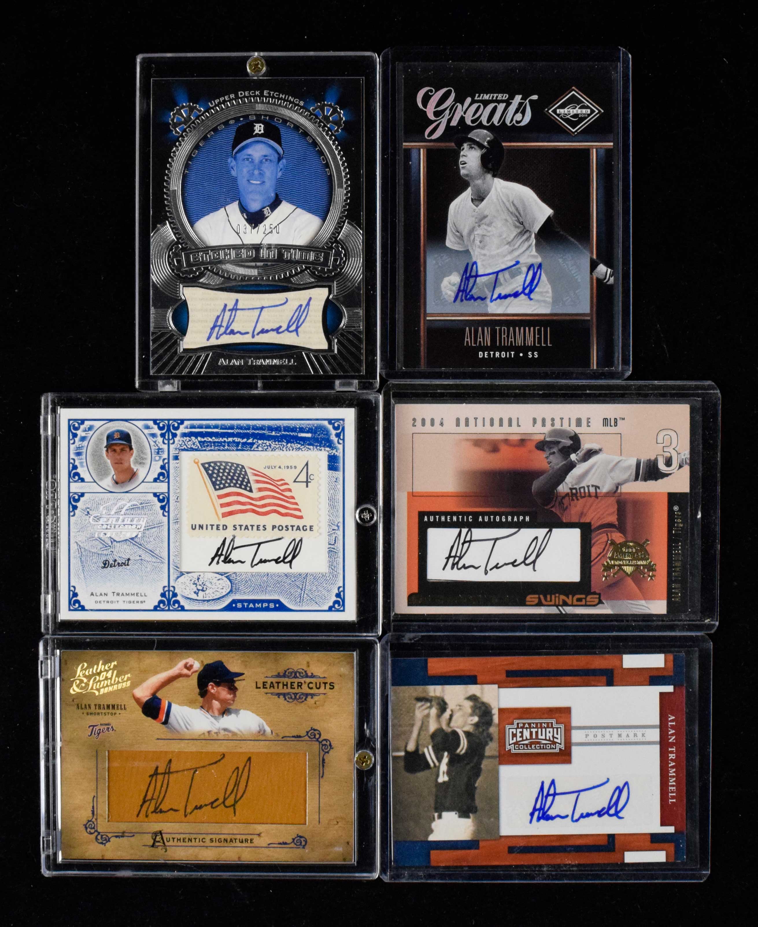Description:Lot of (12) Alan Trammell signed insert cards including serial numbered (NM-NM/MT overall). Includes 2002 Donruss Diamond Kings "Diamond Cut Collection" #DC-16 signed by Trammell (#ed 209/500), 2003 Topps Retired Signature Edition "Autographs" #TA-AT signed by Trammell, 2003 Donruss Signature "Legends of Summer Autographs" #LS-2 signed by Trammell, 2004 Topps Retired Signature Edition "Autographs" #TA-AT signed by Trammell, 2004 Donruss Leather & Lumber "Leather Cuts Glove Autographs" #LC-48 signed by Trammell (#ed 21/224), 2004 Fleer National Pastime "Signature Swings Gold" #SSA-AT signed by Trammell (#ed 62/138), 2004 Upper Deck Etchings "Etched in Time Autograph Blue" #ET-AT signed by Trammell (#ed 37/250), 2004 Upper Deck Legends Timeless Teams "Autographs" #265 signed by Trammell, 2005 Donruss Greats "Signatures Gold HoloFoil" #2 signed by Trammell, 2005 Leaf Century "Stamps Signature USA Flag" #S-61 signed by Trammell (#ed 58/100), 2010 Panini Century "Postmarks Silver Signatures" #93 signed by Trammell (#ed 111/226), and 2011 Panini Limited "Greats Signatures" #15 signed by Trammell (#ed 336/499). Signatures rate 8 to 10 out of 10: NM-NM/MT overall