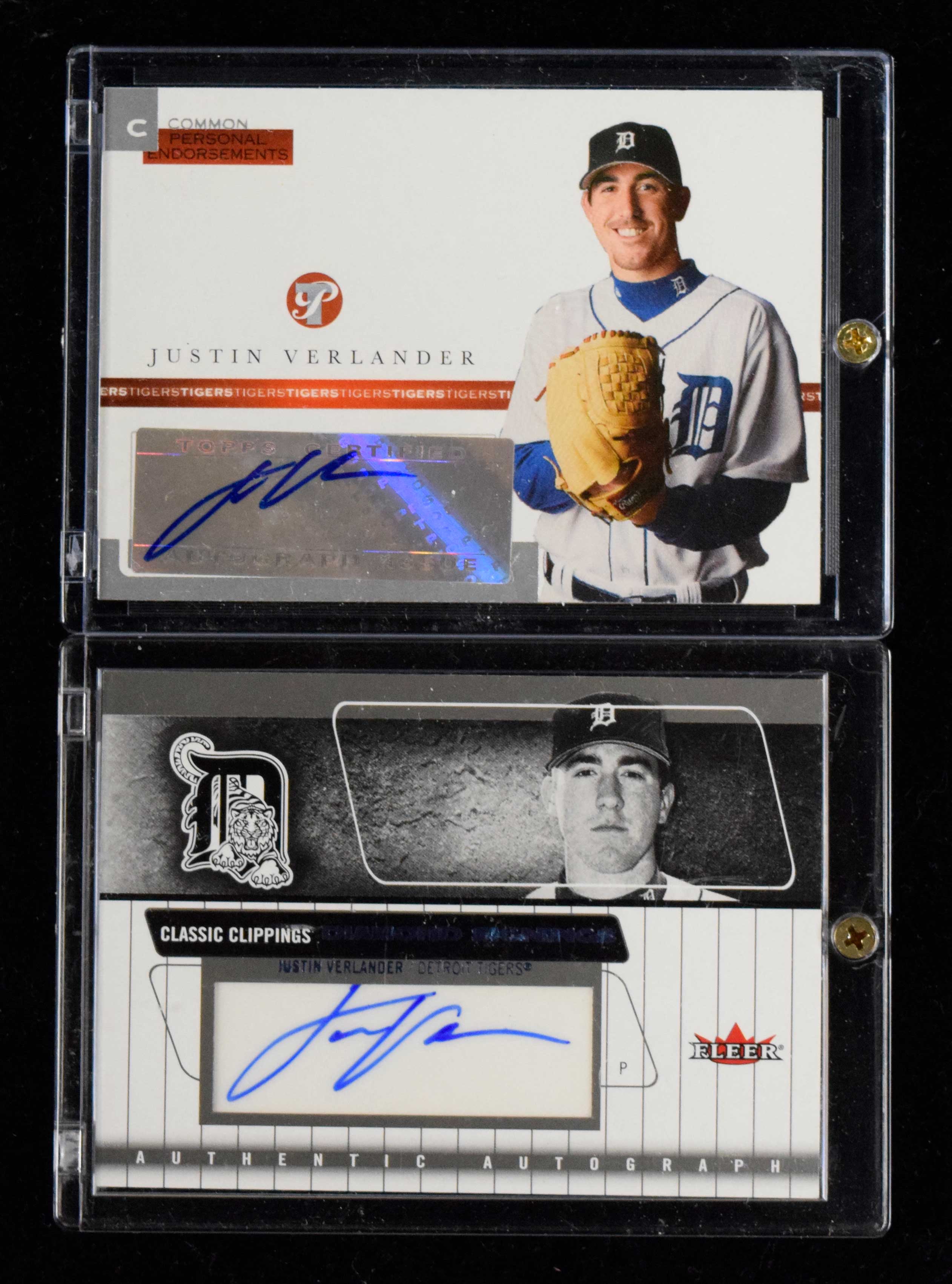 Description:Lot of (2) Justin Verlander signed 2005 rookie insert cards (NM-NM/MT). Includes 2005 Topps Pristine "Personal Endorsements" #PEC-JV signed by Verlander (#ed 267/497), and 2005 Fleer Classic Clippings "Diamond Signings Single Blue" #DS-JV signed by Verlander (production run of 150). Signatures rate 9 to 10 out of 10: NM-NM/MT