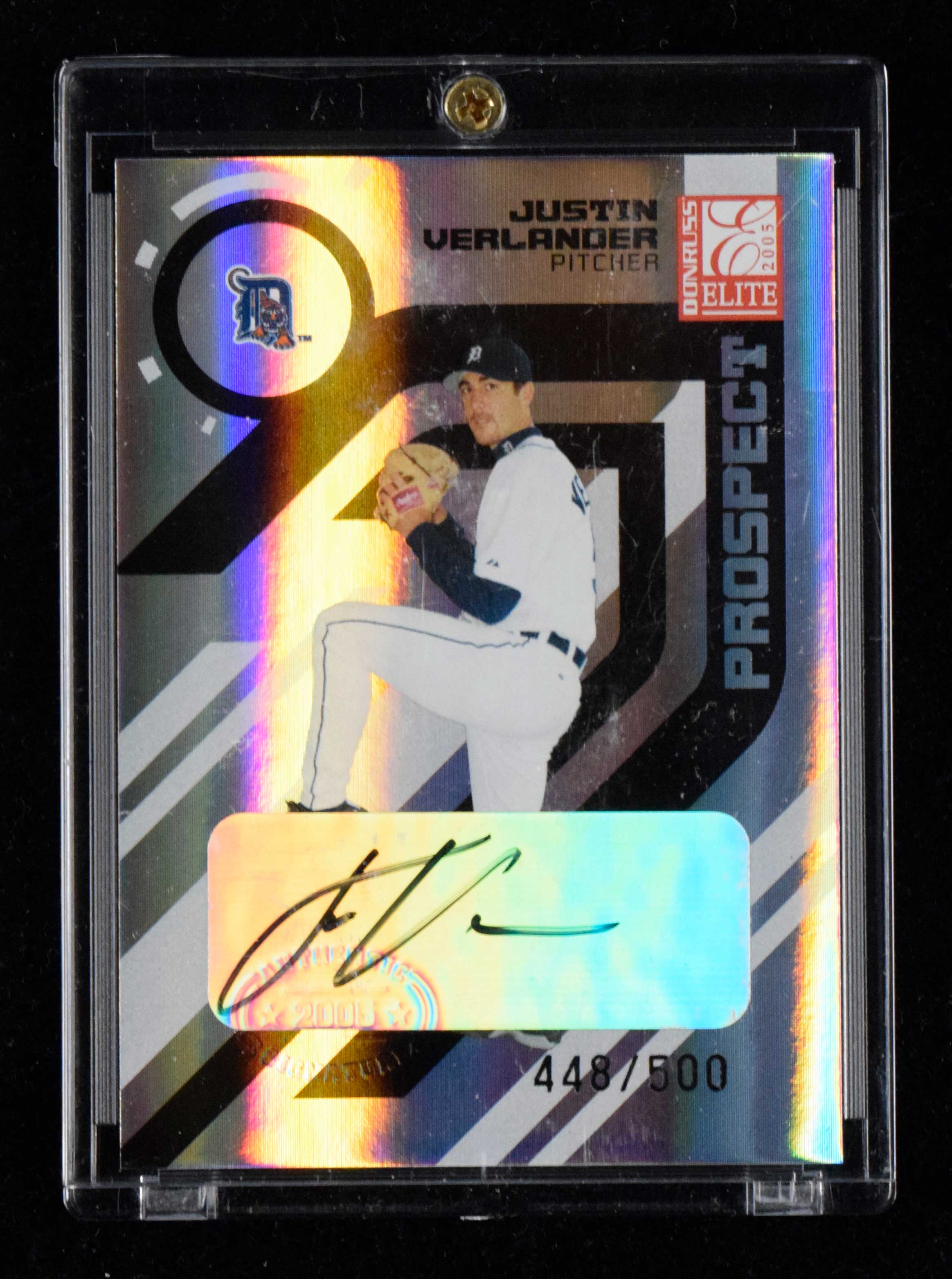 Description:Justin Verlander signed 2005 Donruss Elite serial numbered rookie card (NM). 2005 Donruss Elite #176 signed by Verlander in black marker. Signature rates 8/9 out of 10. The card is #ed 448/500: NM