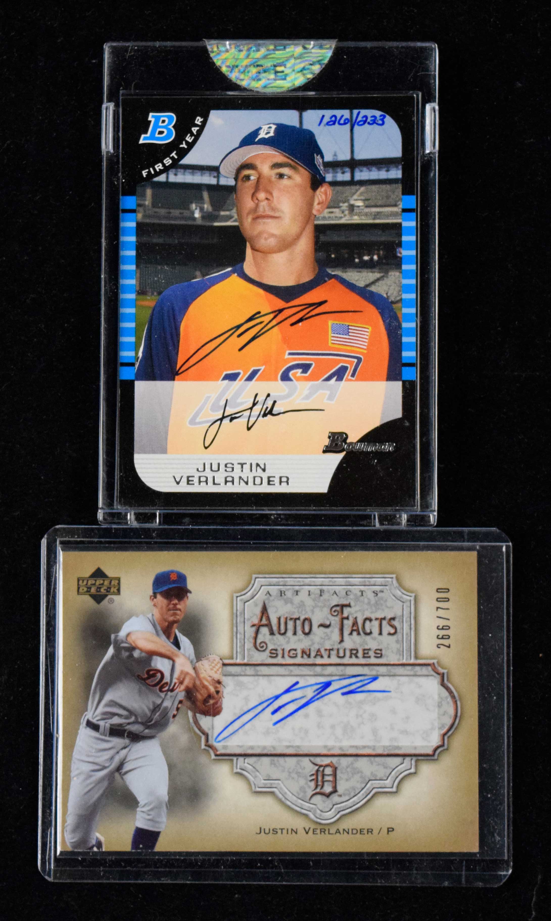 Description:Lot of (2) Justin Verlander signed serial numbered insert cards (NM-NM/MT). Includes 2006 Bowman Sterling "Original Autographs" 2005 Bowman Draft #BDP129 signed by Verlander (#ed 126/233), and 2006 Upper Deck Artifacts "Auto-Facts Signatures" #AF-JV signed by Verlander (#ed 266/700). Signatures rate 9 to 10 out of 10: NM-NM/MT