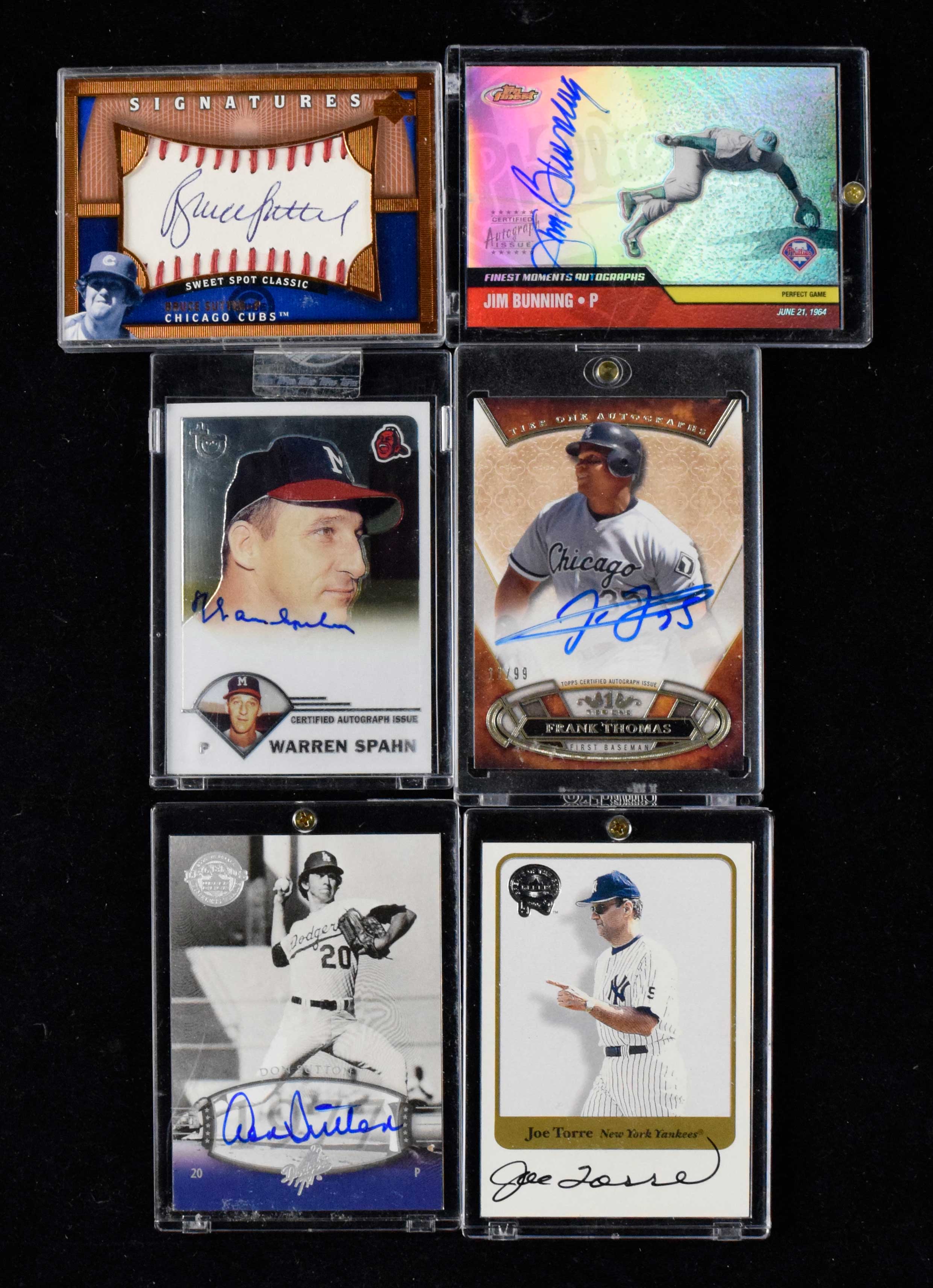 Description:Lot of (9) Baseball HOFers signed insert cards (NM-NM/MT overall). Includes 2001 Fleer Greats of the Game "Autographs" signed by Warren Spahn, 2001 Fleer Greats of the Game "Autographs" signed by Joe Torre, 2002 Topps Finest "Moments Autographs" #FMA-JB signed by Jim Bunning, 2003 Topps Retired Signature Edition "Autographs" #TA-WS signed by Warren Spahn, 2004 Upper Deck Legends Timeless Teams "Autographs" #139 signed by Don Sutton, 2005 Upper Deck Sweet Spot Classic "Signatures" #SU signed by Bruce Sutter, 2013 Topps "Redemption Replacement Autographs" signed by Don Sutton, 2014 Panini Hall of Fame "Signatures" #11 signed by Bruce Sutter, and 2015 Topps Tier One "Autographs" #TOA-FT signed by Frank Thomas (#ed 11/99). Signatures rate 8 to 10 out of 10: NM-NM/MT overall