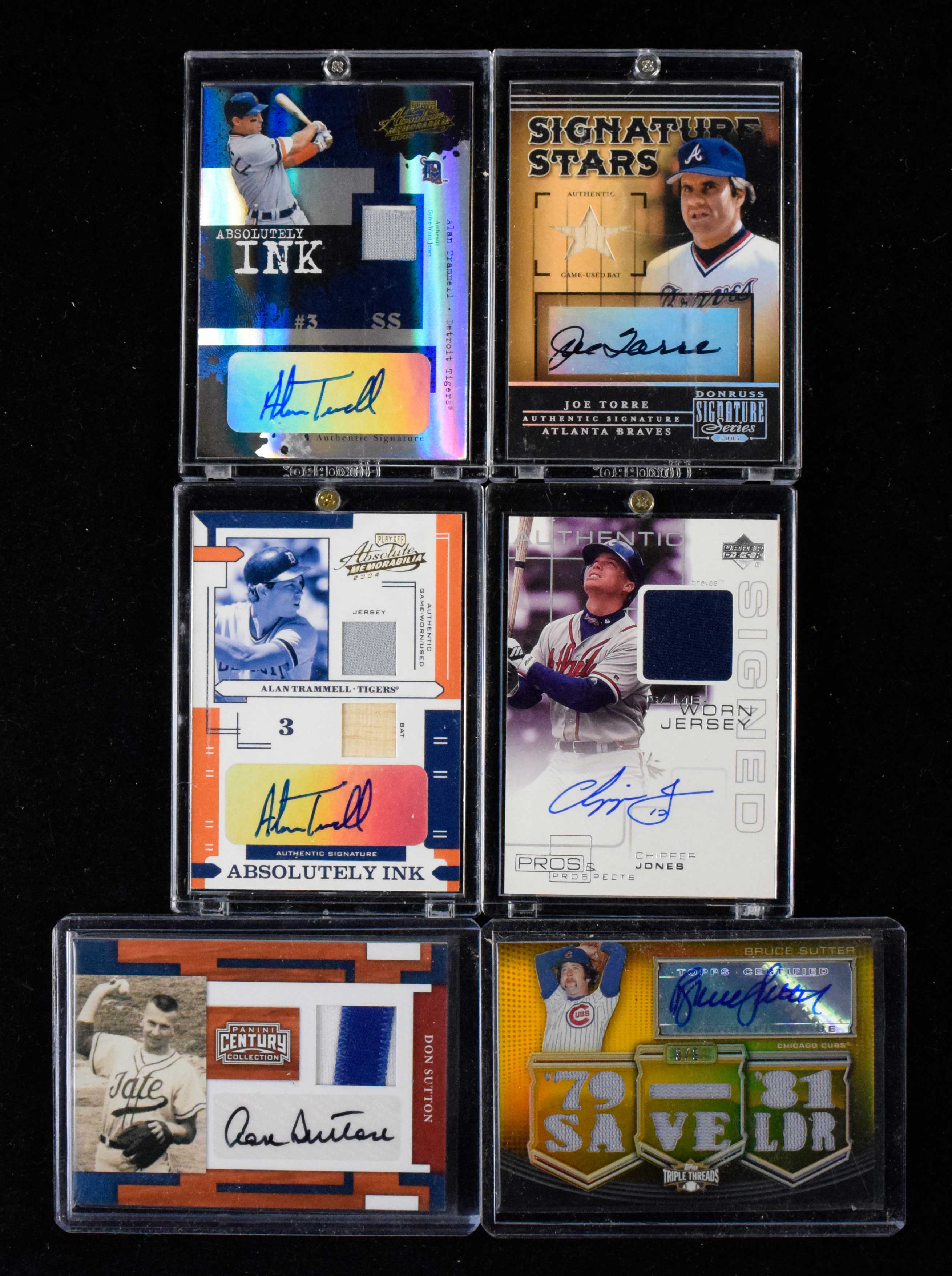 Description:Lot of (7) Baseball HOFers signed game used relic swatch insert cards (NM-NM/MT). Includes 2000 Upper Deck Pros & Prospects "Game-Worn Jerseys Signed" #CJ signed by Chipper Jones, 2004 Playoff Absolute Memorabilia "Absolutely Ink Combo Material" #AI-3 signed by Alan Trammell (#ed 15/50), 2005 Donruss Signature Series "Stars Autograph Material Bat" #SS-12 signed by Joe Torre, 2005 Playoff Absolute Memorabilia "Absolutely Ink Swatch Single Spectrum" #AI-102 signed by Alan Trammell (#ed 35/50), 2005 Playoff Absolute Memorabilia "Marks of Fame Autograph Swatch" #MF-17 signed by Don Sutton (#ed 52/125), 2010 Topps Triple Threads "Autograph Relics Gold" #TTAR-182 signed by Bruce Sutter (#ed 3/9), and 2010 Panini Century "Materials Jerseys Prime Signatures" #92 signed by Don Sutton (#ed 4/50). Signatures rate 8 to 10 out of 10: NM-NM/MT