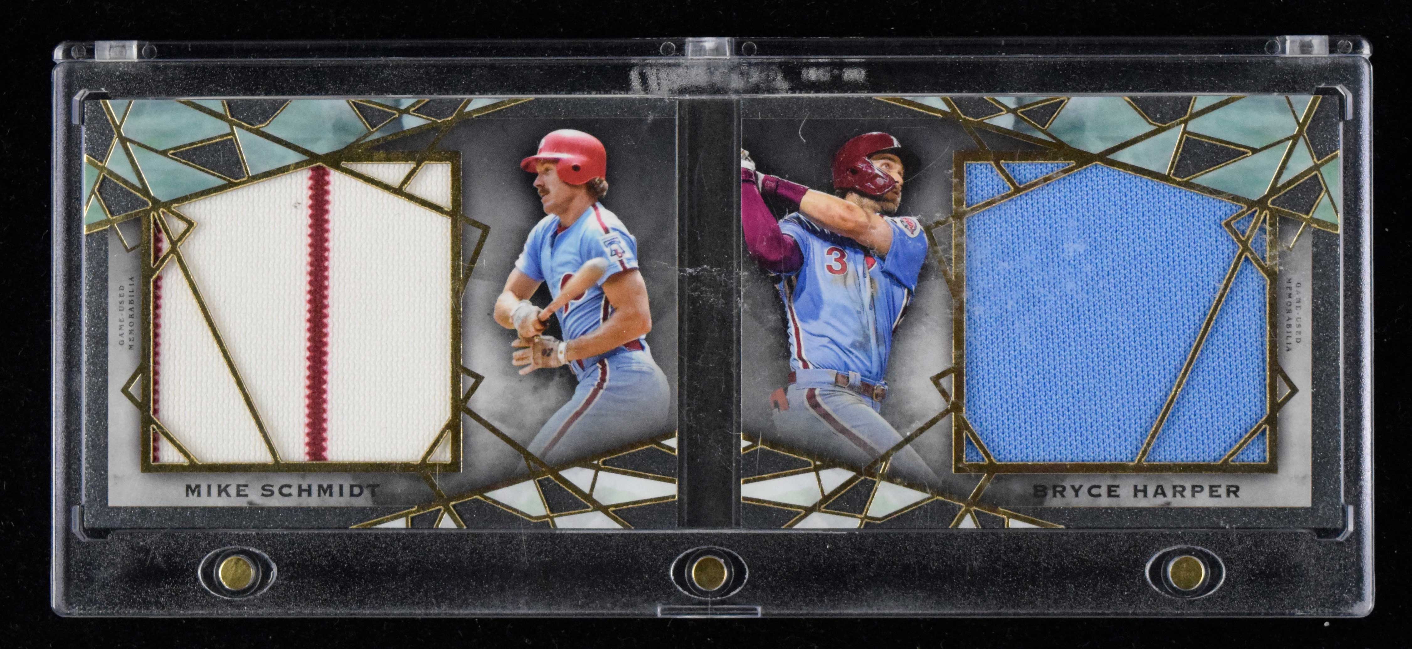 Mike Schmidt & Bryce Harper 2022 Topps Diamond Icons dual relics booklet insert card #ed 3/10 (NM). 2022 Topps Diamond Icons "Dual-Player Dual Relic Book" #DPDR-SH containing Mike Schmidt and Bryce Harper jersey relics. The card is numbered 3/10: NM