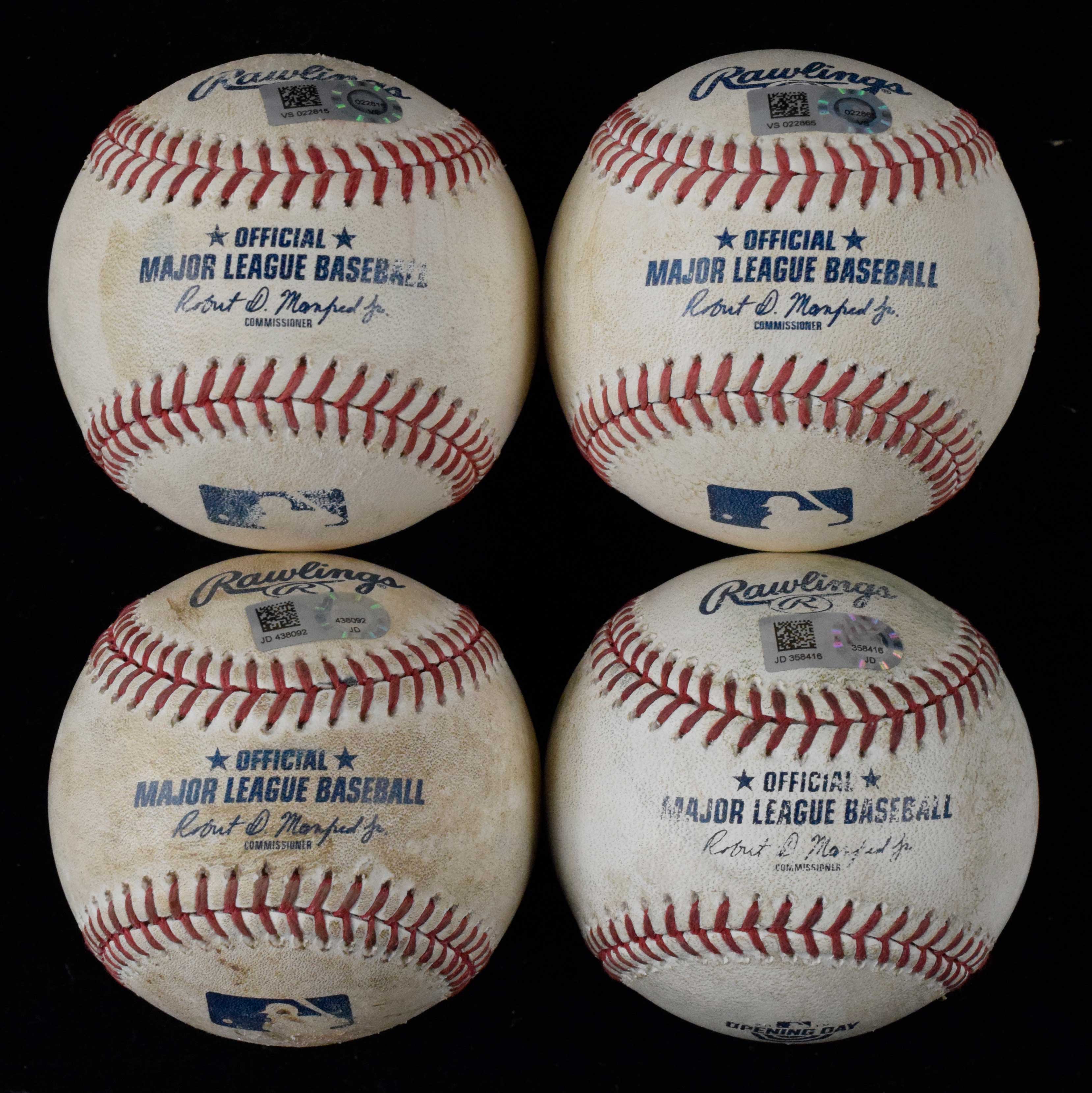 Description:Lot of (4) Philadelphia Phillies game used baseballs from 2018-2020 - MLB Authenticated (VG/EX-EX). Includes 4/10/2018 Cincinnati Reds at Phillies ball pitched by Homer Bailey to Odubel Herrera for a ball, 3/28/2019 Atlanta Braves at Phillies opening day ball used for 6-pitches during Ronald Acuna walk off of Aaron Nola, 7/26/2020 Miami Marlins at Phillies ball hit for a foul ball by Jon Berti off of Vince Velasquez, and 8/5/2020 New York Yankees at Phillies ball hit by Gleyber Torres for a groundout off of Zack Wheeler. MLB Authenticated serial #ed hologram sticker is on each ball: VG/EX-EX