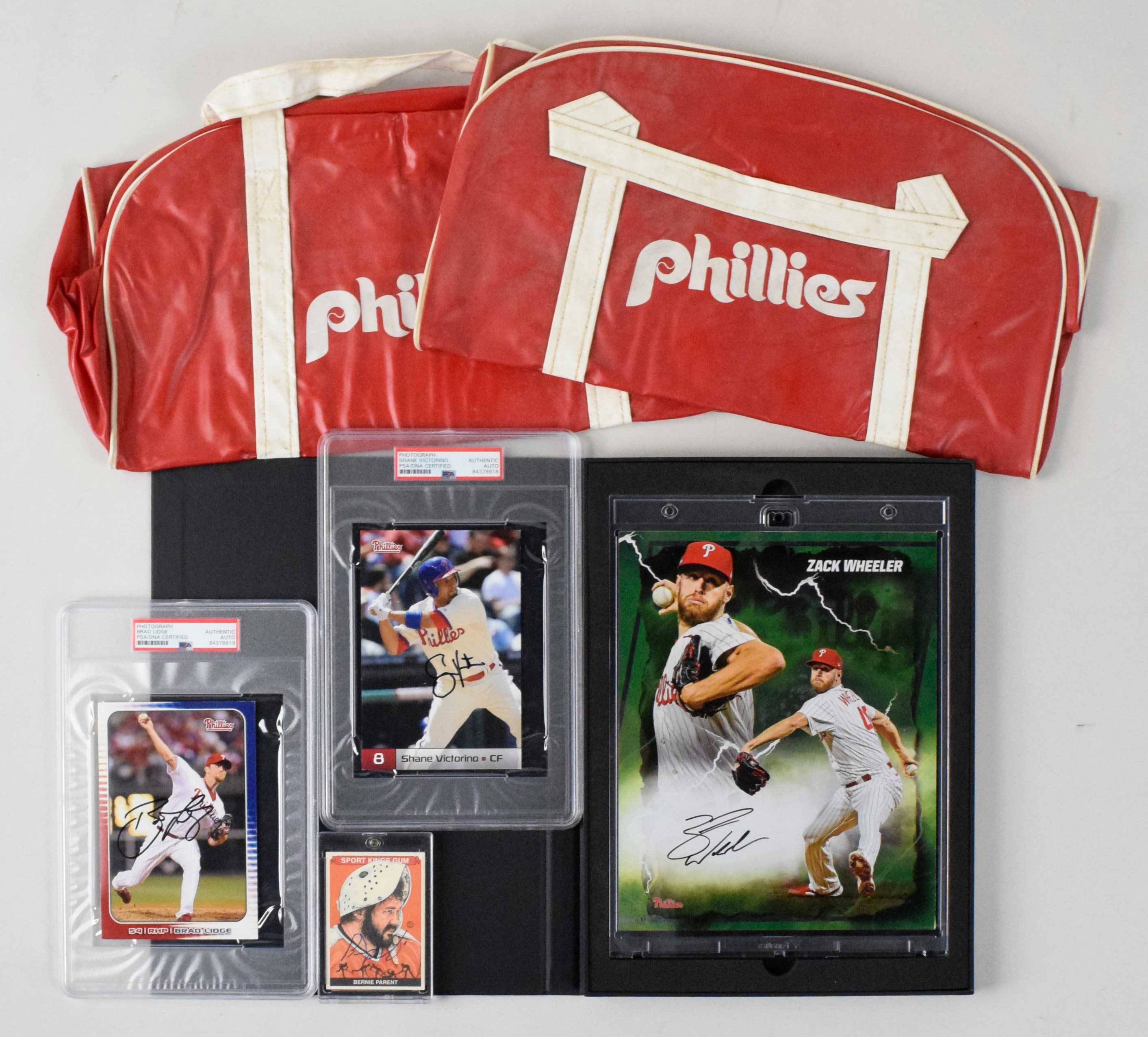 Description:Lot of assorted sports memorabilia and autographs (VG/EX-NM/MT). Autographs include 2010 Sportkings Series D #183 signed by Bernie Parent; Fanatics 8"x10" Green Emanate Photograph signed by Zack Wheeler (#ed 30/99 and MLB Authenticated); 2011 Phillies team issue photo card signed by Brad Lidge (PSA/DNA); (6) 2012 Phillies team issue photo cards signed by Shane Victorino (all PSA/DNA); and (3) signed Phillies hats: Nick Pivetta, Jake Thompson, and Vincent Velasquez (each MLB Authenticated). Signatures rate 8 to 10 out of 10. Also includes (2) c.1970s Philadelphia Phillies duffel bags, 2003 Majestic MLB Authentic Collection size 48 Phillies #88 Hank King professional model batting practice jersey (Phillies scout) with pants and socks (stains), modern yearbooks, and some other items: VG/EX-NM/MT