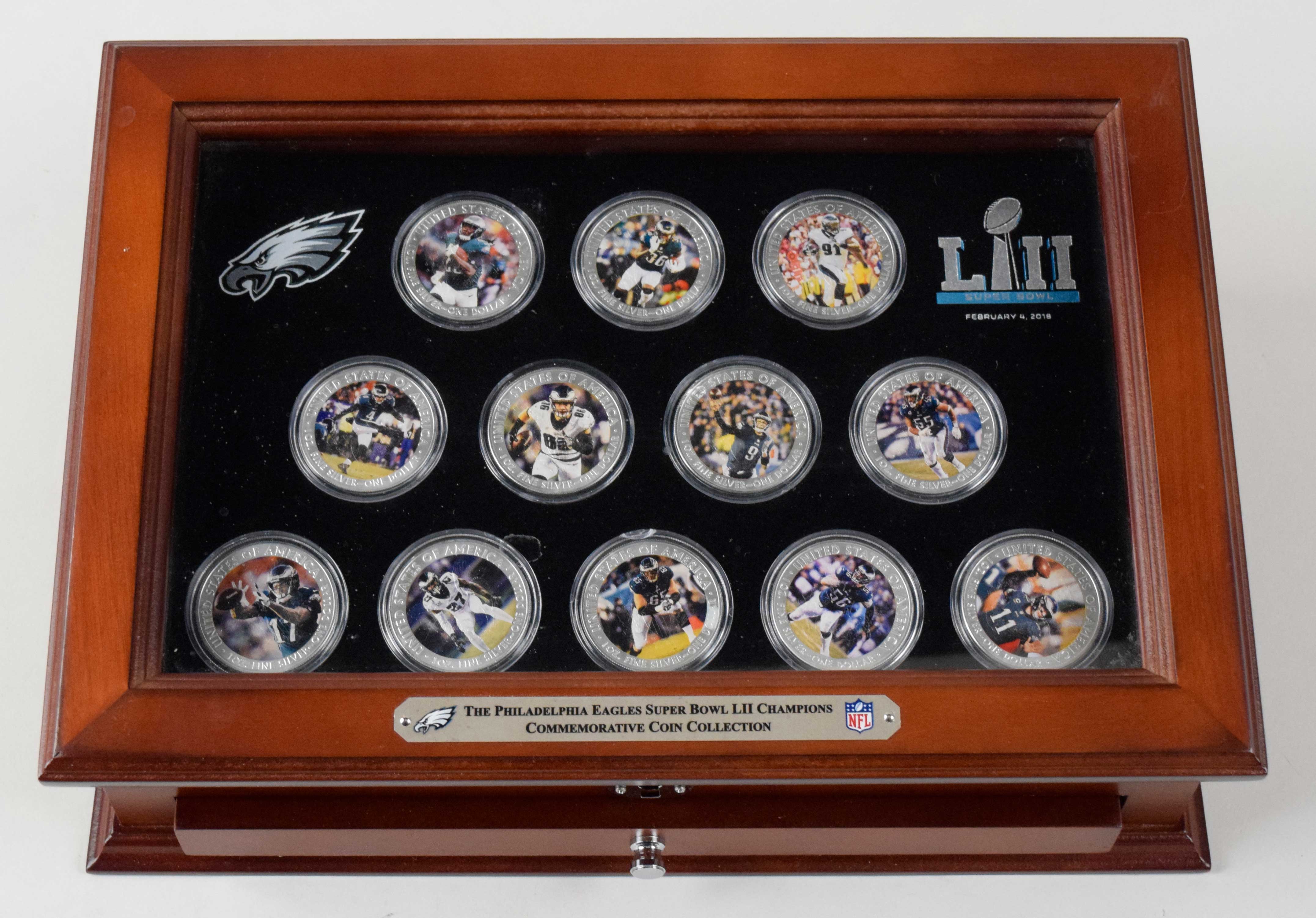 Description:Set of (12) Philadelphia Eagles 1-oz. Super Bowl LII Champions silver dollars with display case (NM-NM/MT). Includes Nick Foles, Lane Johnson, Fletcher Cox, Carson Wentz, Malcolm Jenkins, Brandon Graham, Zach Ertz, Alshon Jeffery, LeGarrette Blount, Jay Ajayi, Jake Elliott, and Chris Long. Each silver dollar contains 1-oz. of 99.9% pure silver, and are #ed out of 2018. Includes wooden display chest: NM-NM/MT