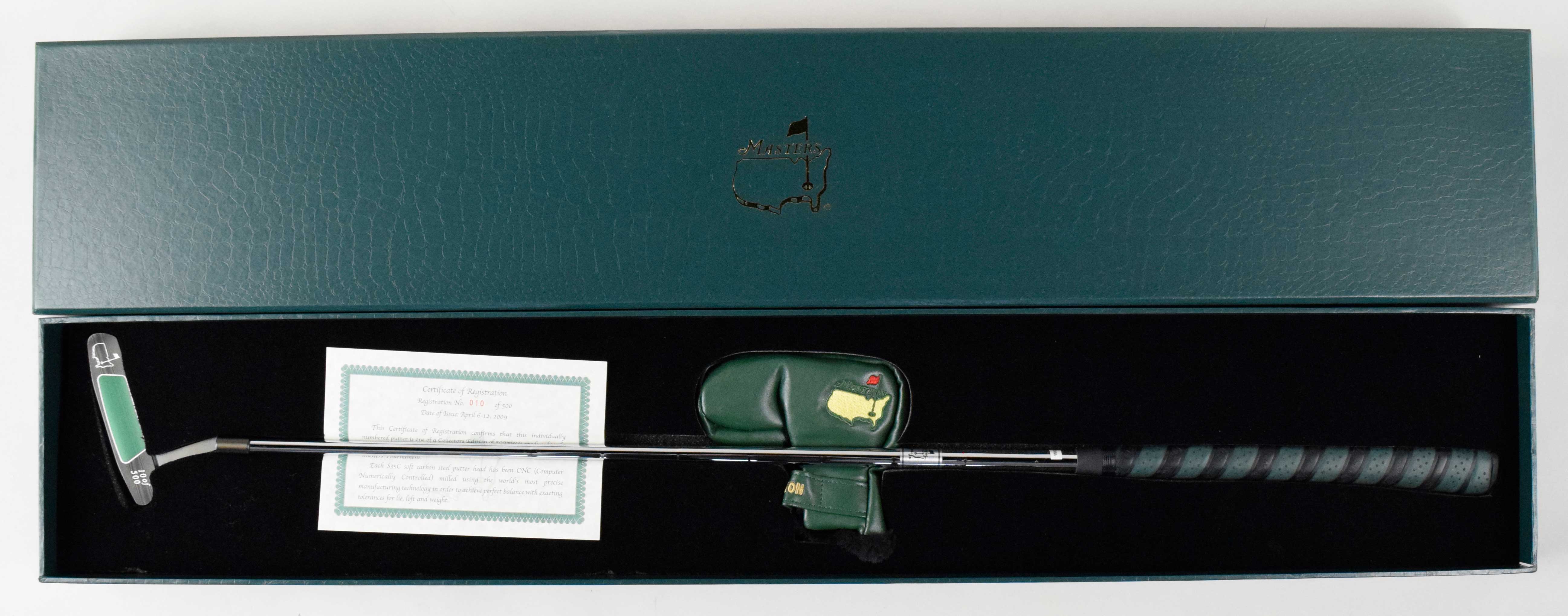 Description:Limited edition Masters putter (NM/MT). Collectors edition produced exclusively for the 2009 Masters Tournament. Numbered 10/500. Includes certificate of registration, and leather head cover: NM/MT
