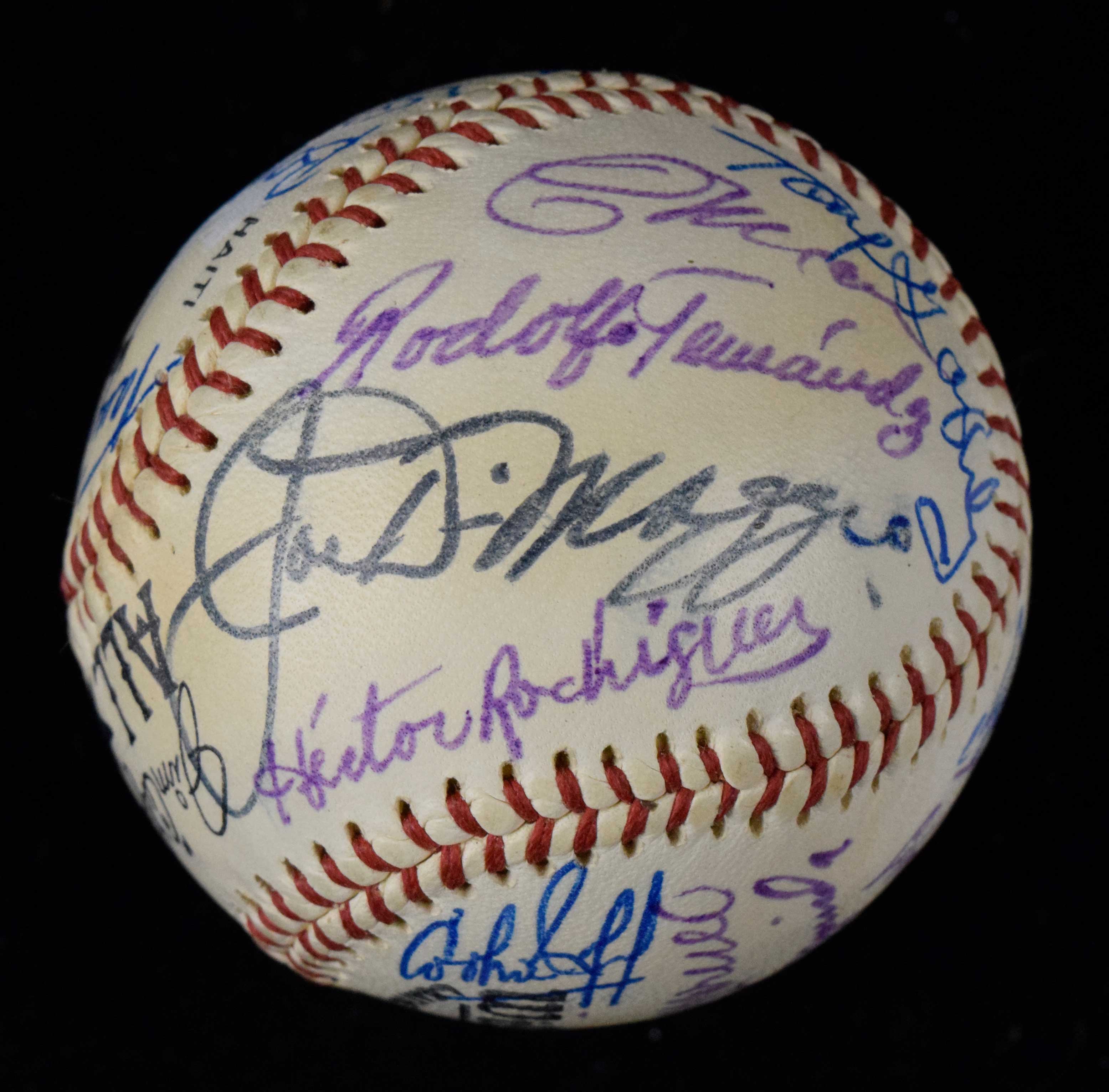 Description:Vintage multi-signed baseball with Joe DiMaggio, Tommy Lasorda, and others, c.1970s (EX). Wilson All-Star Catfish Hunter endorsed ball signed by (22) including Joe DiMaggio, Tom Lasorda, Max Lanier, Cookie Rojas, Tony Taylor, Tony Gonzalez, Willy Miranda, Bobby Bragan, Rodolfo Fernandez, Hector Rodriguez, Nap Reyes, Connie Marrero, Tony Zardon, and others. Signatures rate 6/7 to 9/10 (avg 8) out of 10. Light toning, and an area of white-out on one panel: EX