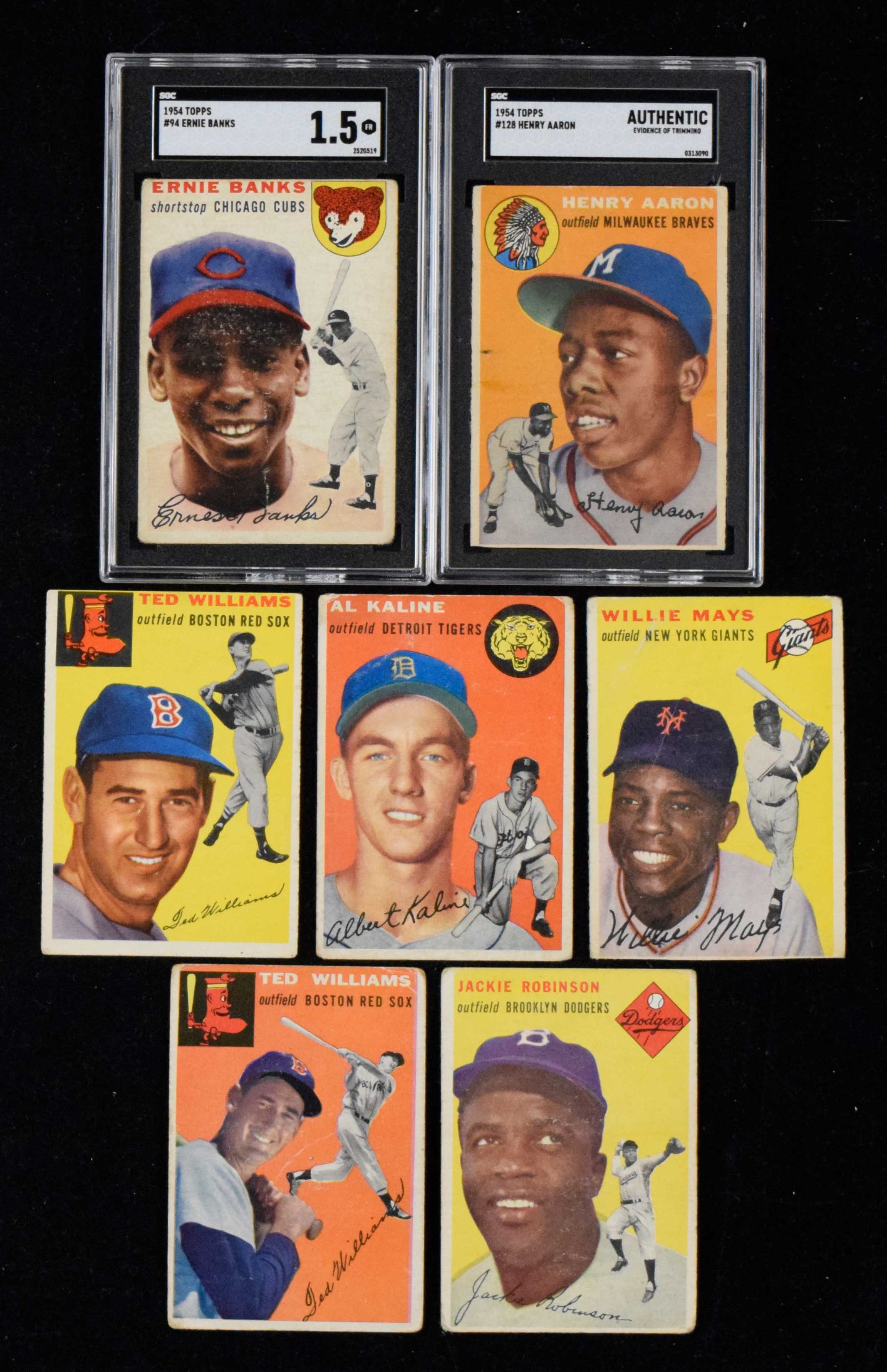 Description:1954 Topps Baseball complete set (250 cards) (Avg. GD, see description) Low grade complete set in average GD condition and general range runs PR-VG. In general the commons are better than the stars. A small portion have been trimmed including several of the key cards as noted below. Keys: #1 Williams (FR), 3 Irvin (GD), 10 Robinson (FR), 13 Martin (FR), 17 Rizzuto (VG), 20 Spahn (GD/VG), 30 Mathews (GD), 32 Snider (FR), 36 Wilhelm (GD/VG), 37 Ford (GD), 45 Ashburn (VG), 50 Berra (GD-GD/VG), 90 Mays (trimmed), 94 Banks (SGC 1.5 FR), 102 Hodges (VG-VG/EX), 128 Aaron (SGC Authentic evidence of trimming), 132 Lasorda (VG), 201 Kaline (FR/GD), and 250 Williams (FR): Avg. GD, see description ($2,000-$3,000)