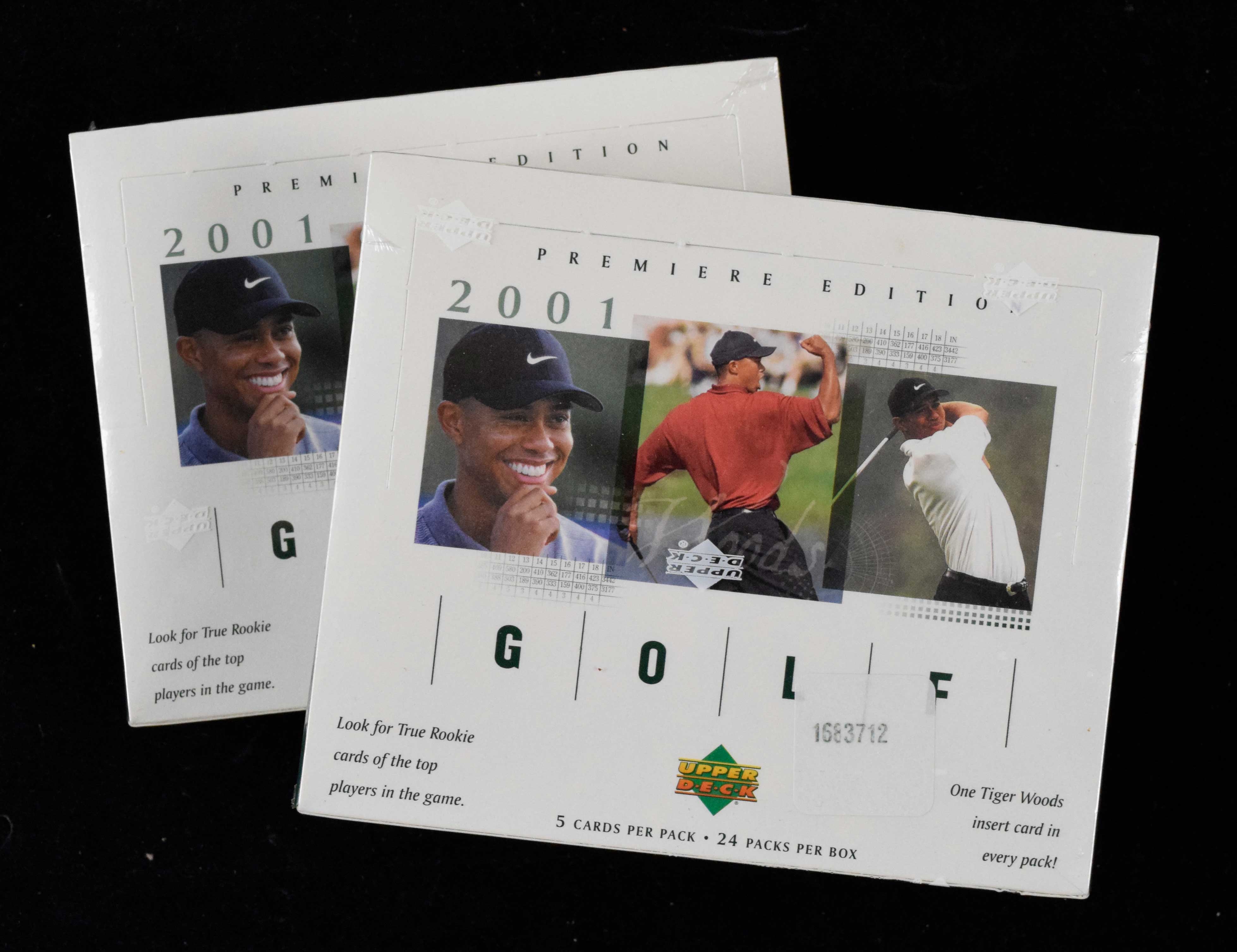 Description:Lot of (2) 2001 Upper Deck Golf factory-sealed hobby boxes, Tiger Woods RC possible (NM/MT). Each box has (24) unopened packs with a Tiger Woods insert card in every pack. Woods' rookie card is also possible in the packs. Both boxes remain in their original factory-sealed condition with no mentionable wear: NM/MT.